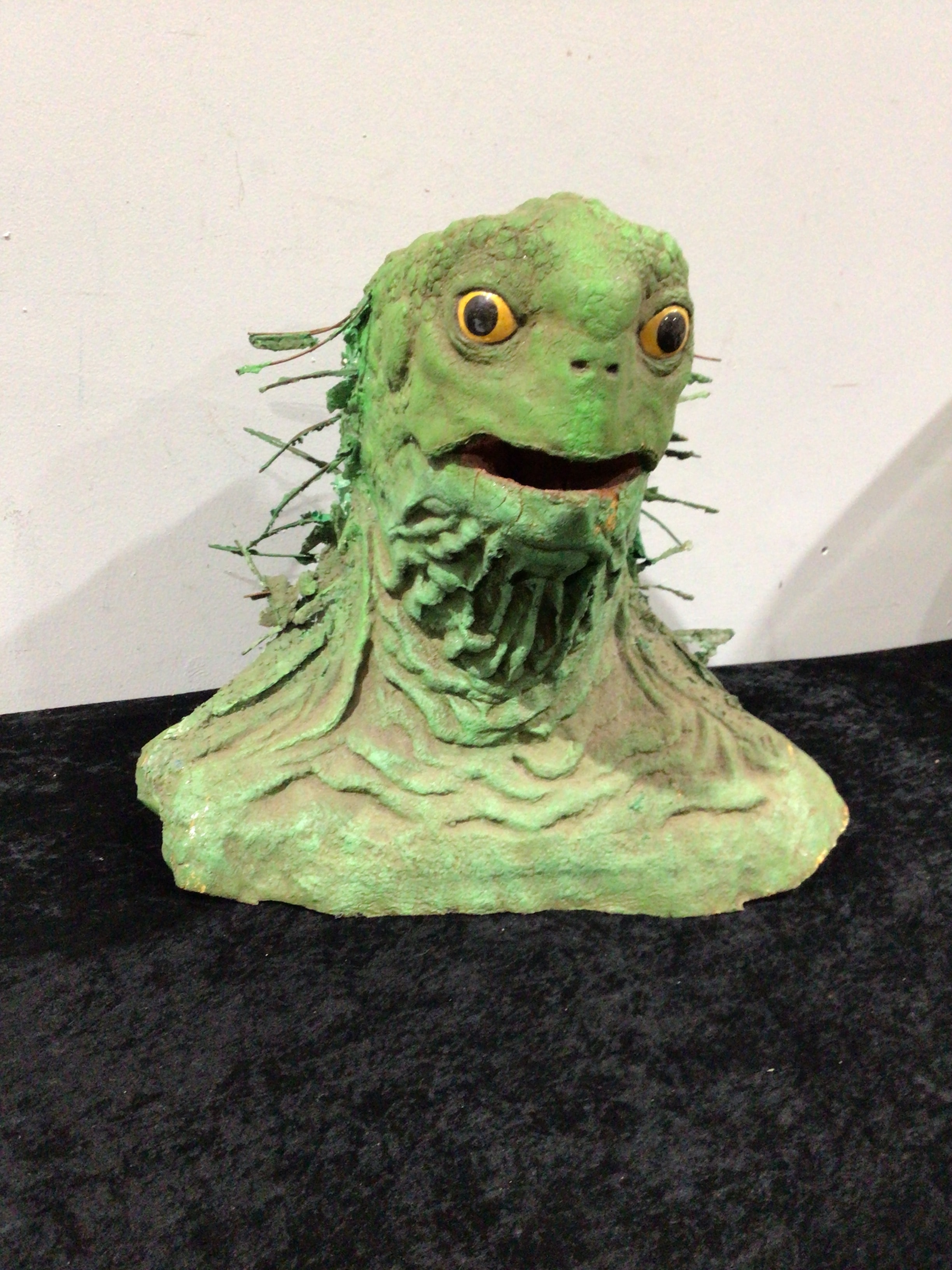 A green creature bust prop, characterized by a textured, scaly appearance, yellow eyes with black pupils, an open mouth, and thin, spiky green protrusions around the head and neck. Zargon The Mind Robber