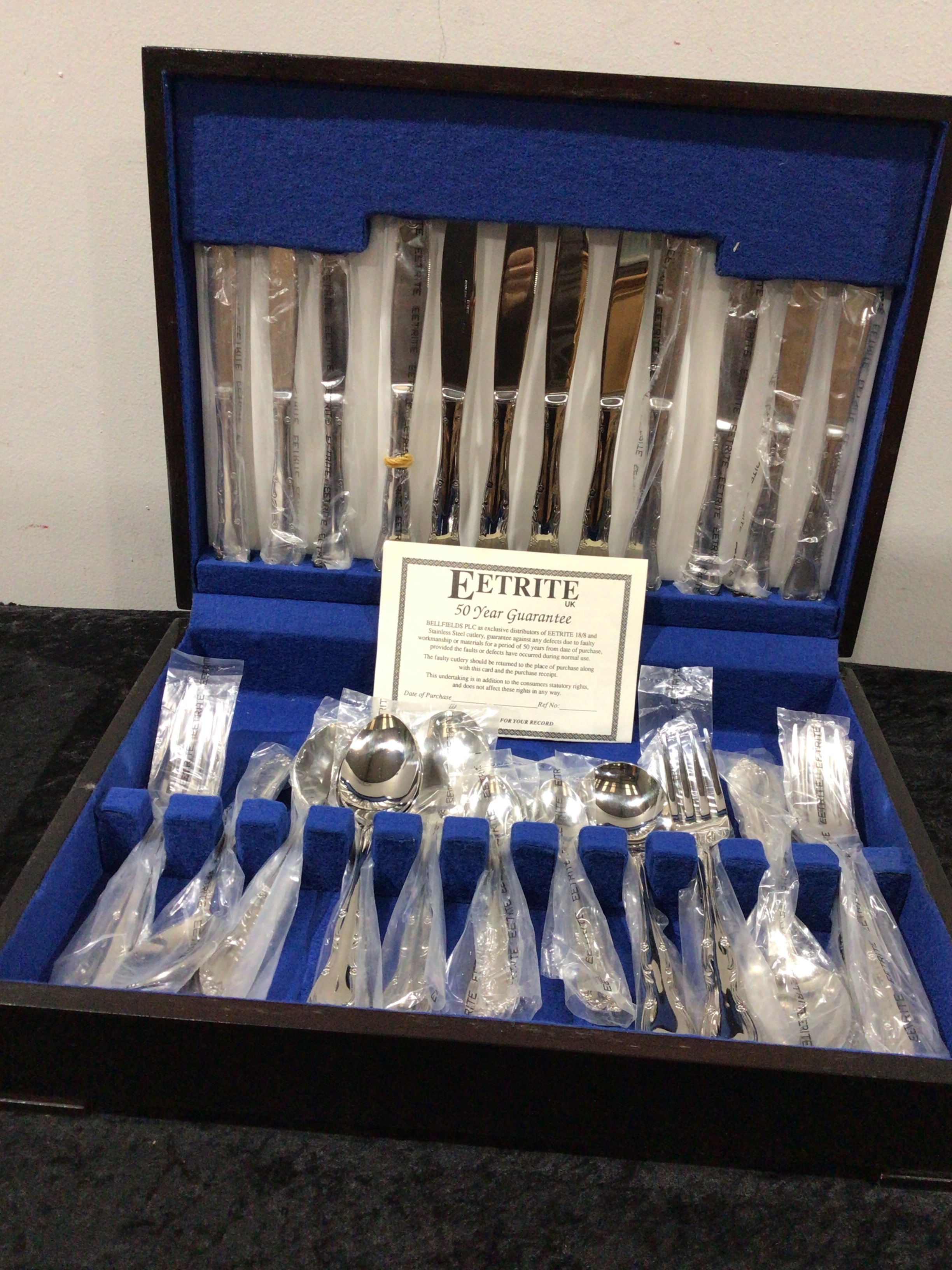 A set of silver-colored EETRITE cutlery, including knives, forks, and spoons, mostly in plastic wrappers, housed in a blue-lined wooden case with an EETRITE UK 50 Year Guarantee card.