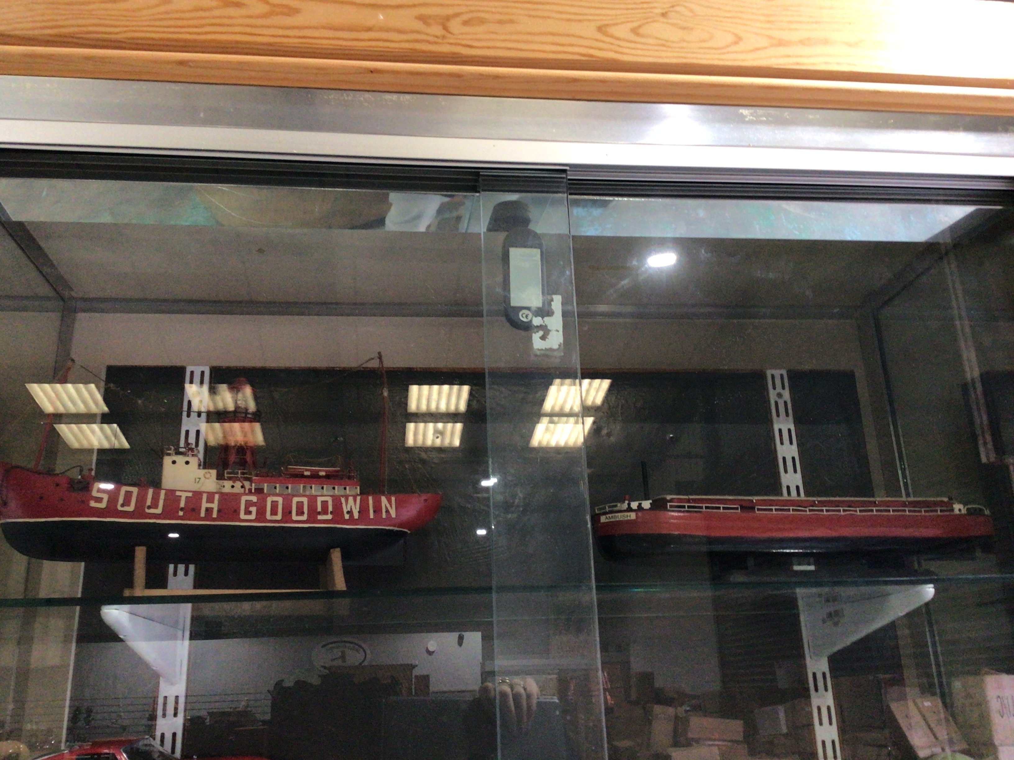 Two wooden model ships, one a red and white freighter named ‘South Goodwin’ and the other a red barge named ‘Ambush’, displayed on stands.