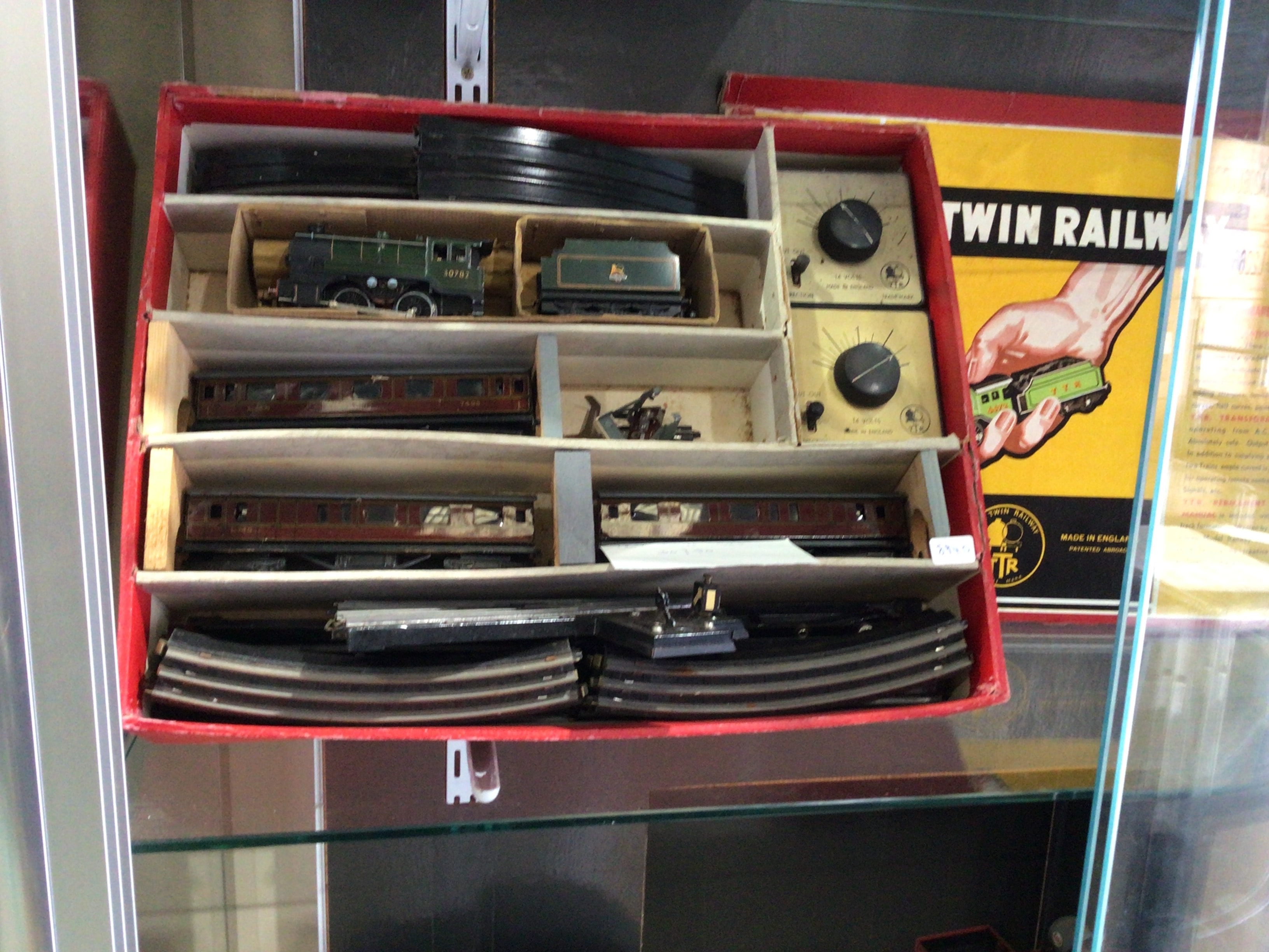 A vintage Trix Twin Railway model train set in a red storage box includes a green and black locomotive ‘30787’, three brown and maroon passenger carriages, a set of black track pieces, and two ‘TTT’/’TR’ control units marked ‘MADE IN ENGLAND’.