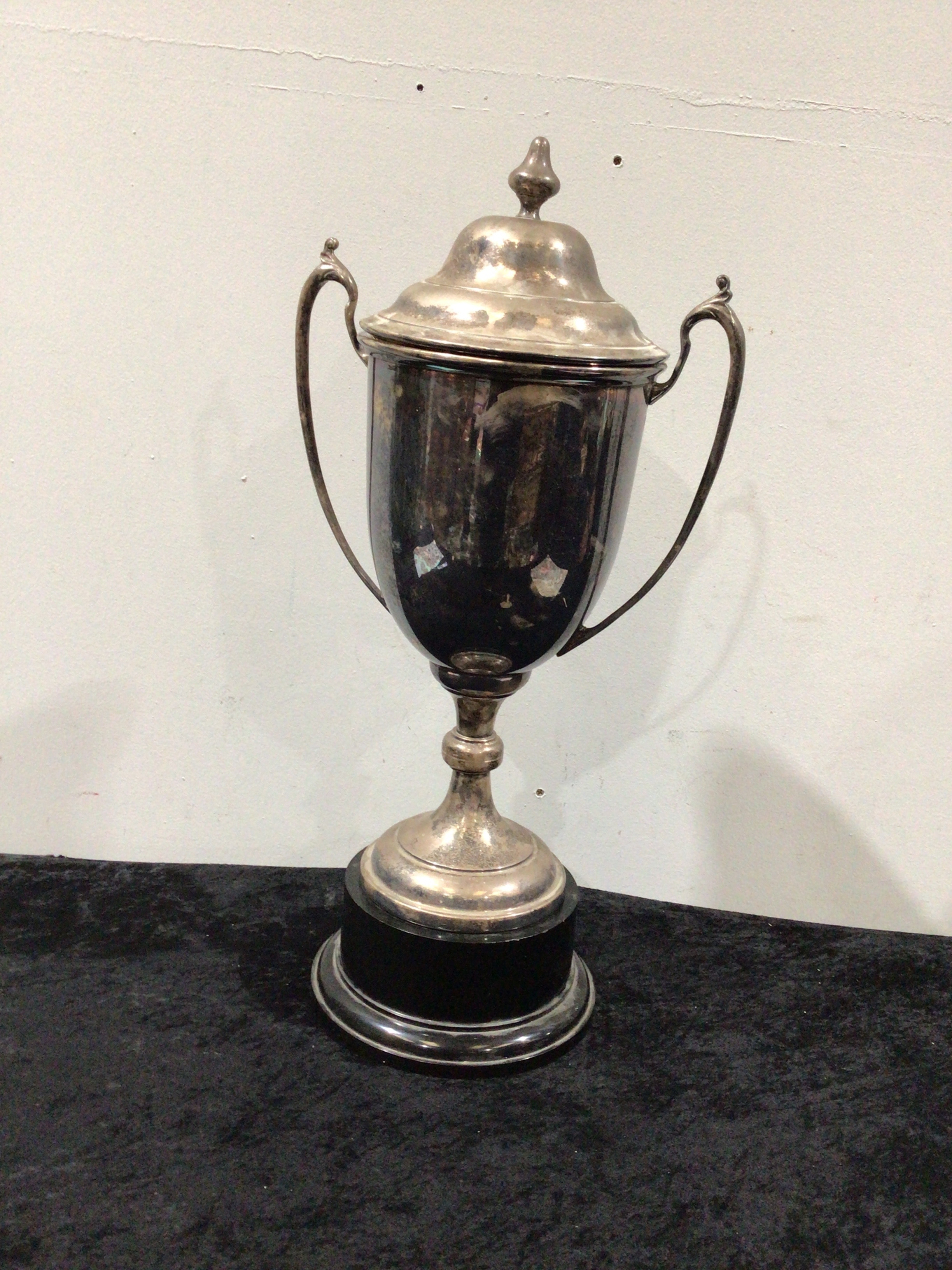 A silver plated large trophy cup with a lid and two handles, standing on a dark, circular base.