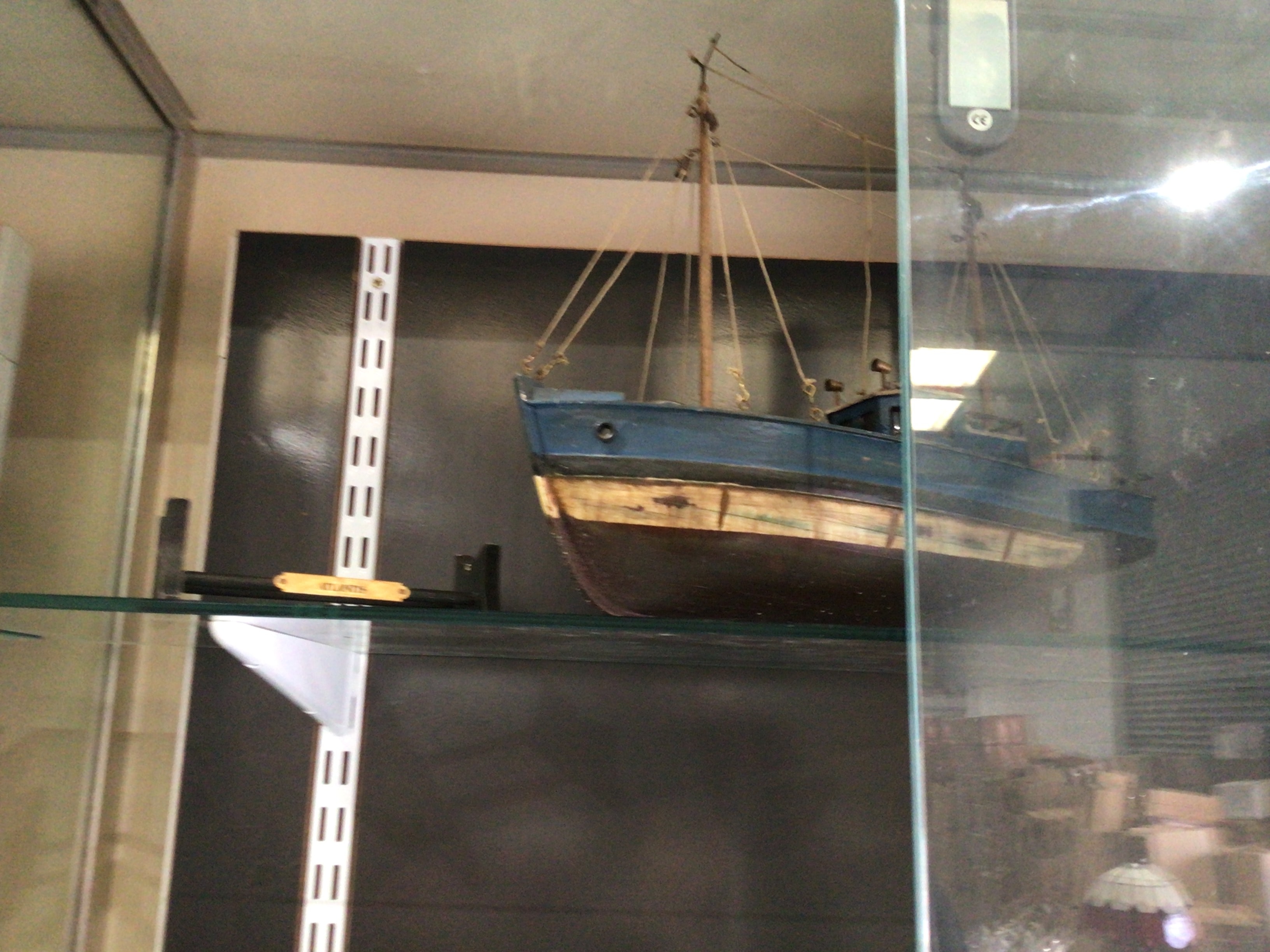A model ship, predominantly blue, tan, and dark brown, with a natural wood mast and light rigging, featuring a yellow label inscribed “ATLANTIS”, likely 1/38 scale.