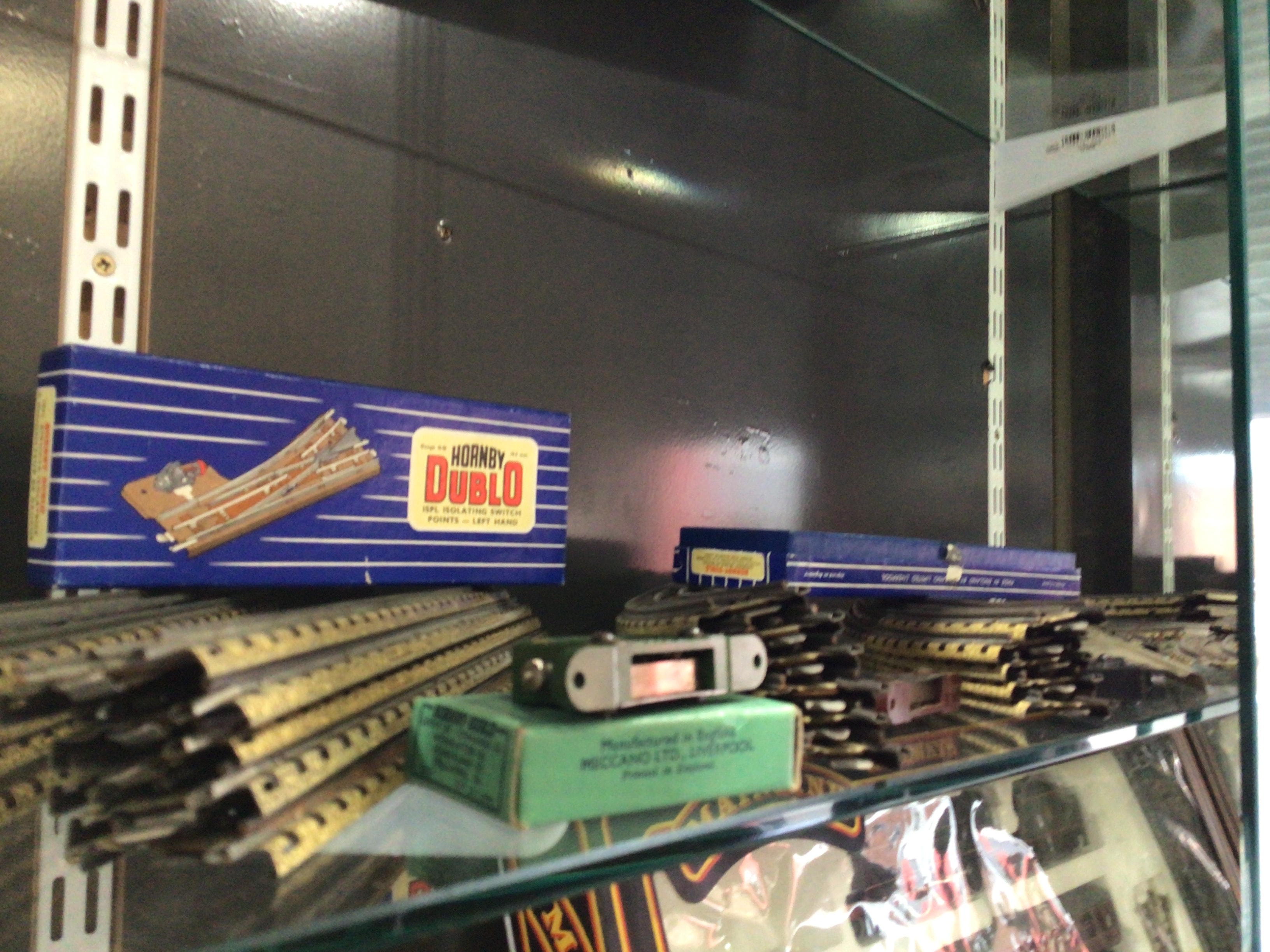A collection of Hornby Dublo 3-rail model railway track, including boxed isolating switch points and loose track sections.