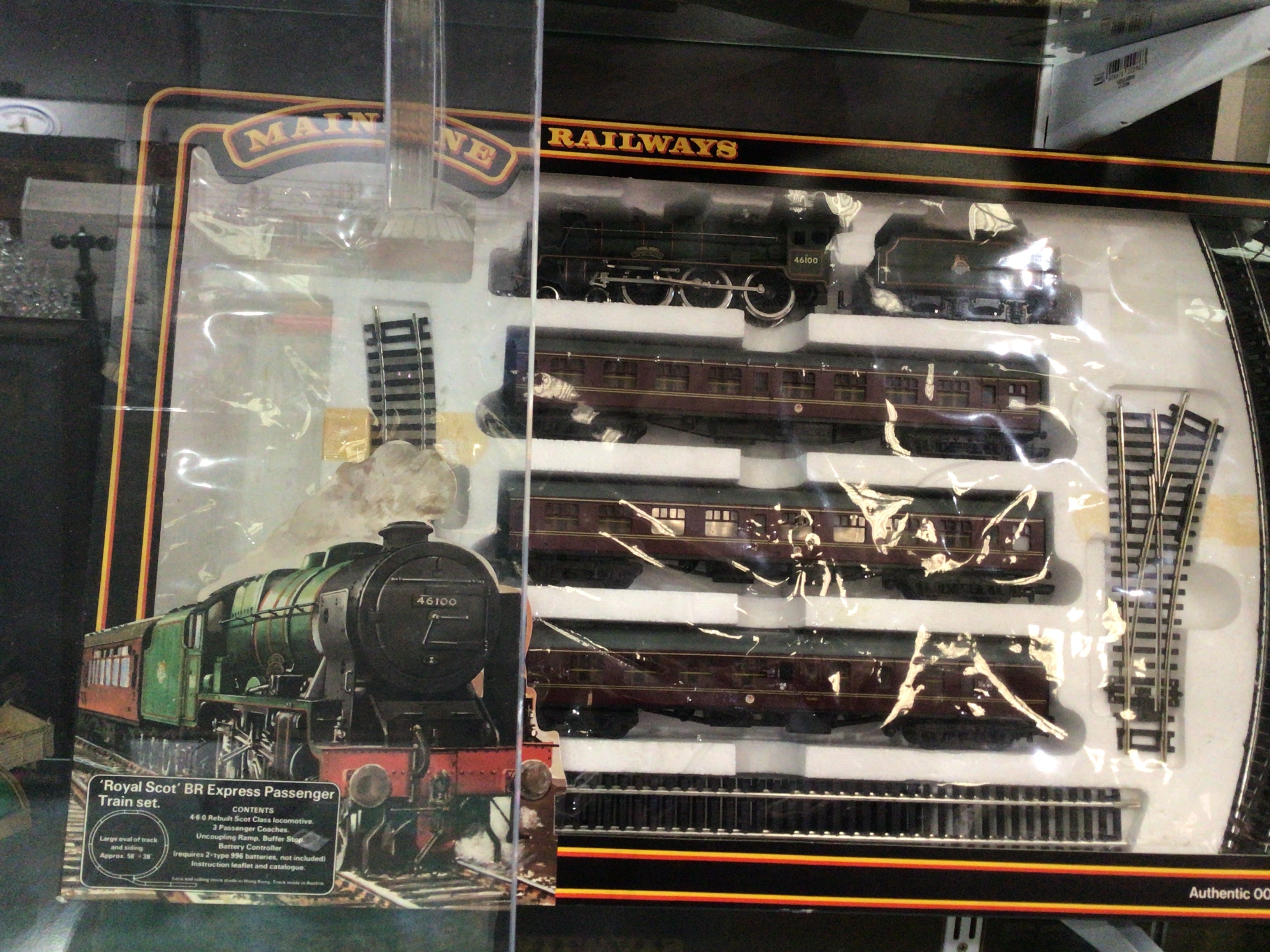 A Mainline Railways for Palitoy ‘Royal Scot’ BR Express Passenger Train set, featuring a black and dark green 4-6-0 locomotive numbered ‘46100’, three dark red passenger coaches, and various 00-gauge track sections, all within its original box labeled ‘Authentic 00’.