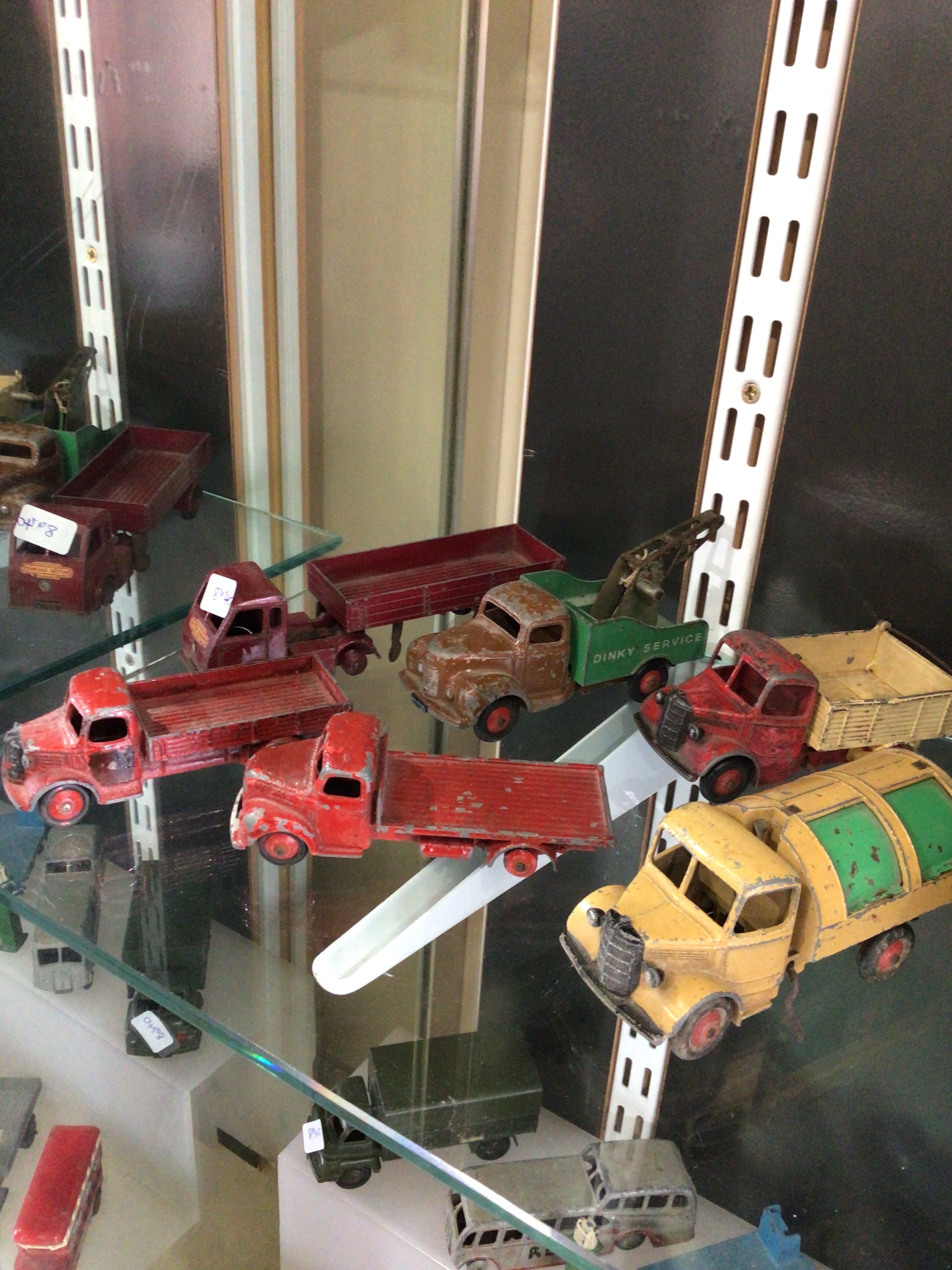 Two faded toy trucks, including a maroon/dark red Fordson pickup/flatbed with “FORDSON” visible on its front, and a dark green military-style covered truck.