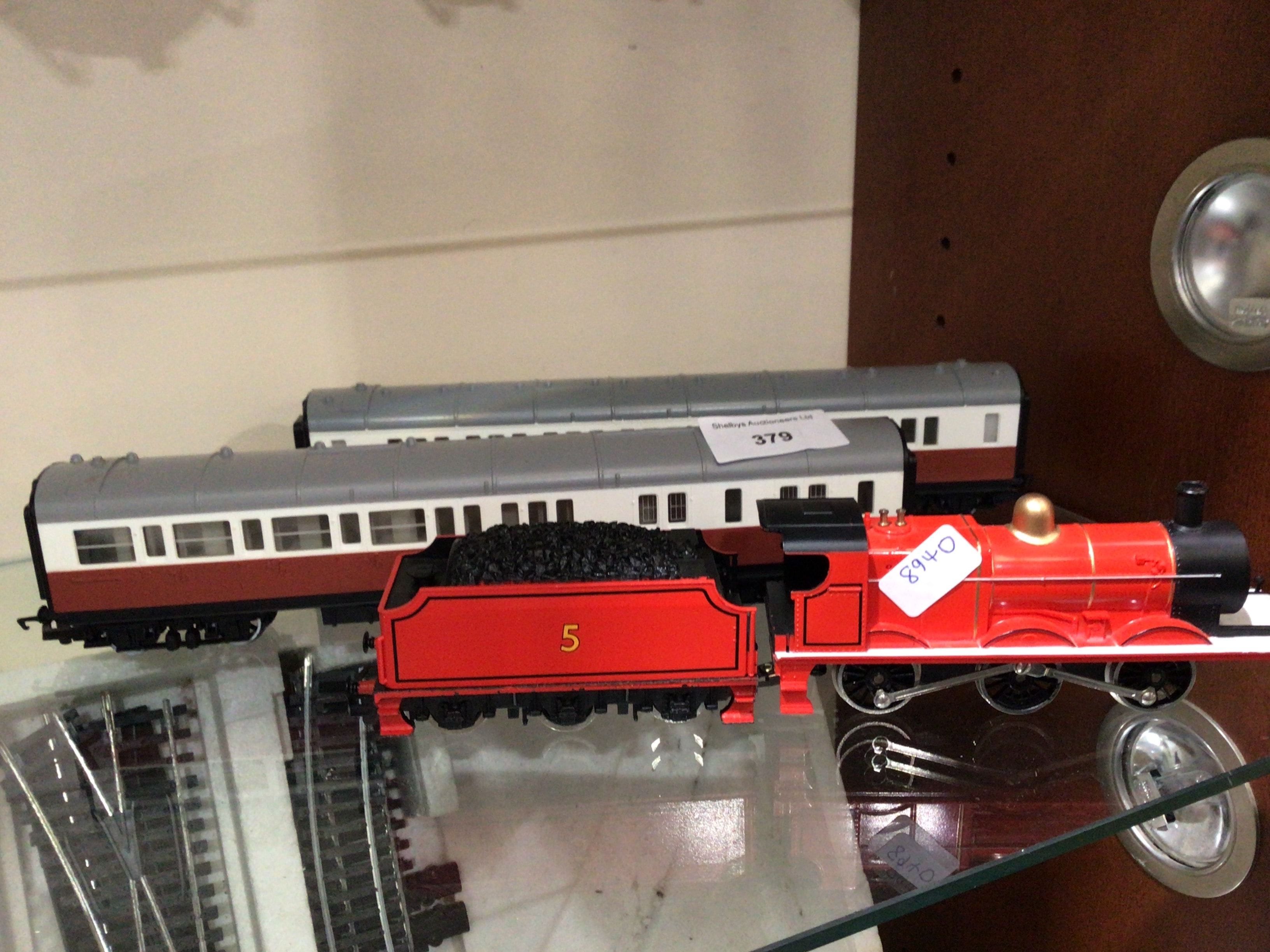 A red and black Hornby James model steam locomotive, comprising an engine with gold detailing and a tender holding simulated coal, featuring the number ‘5’ on its side.