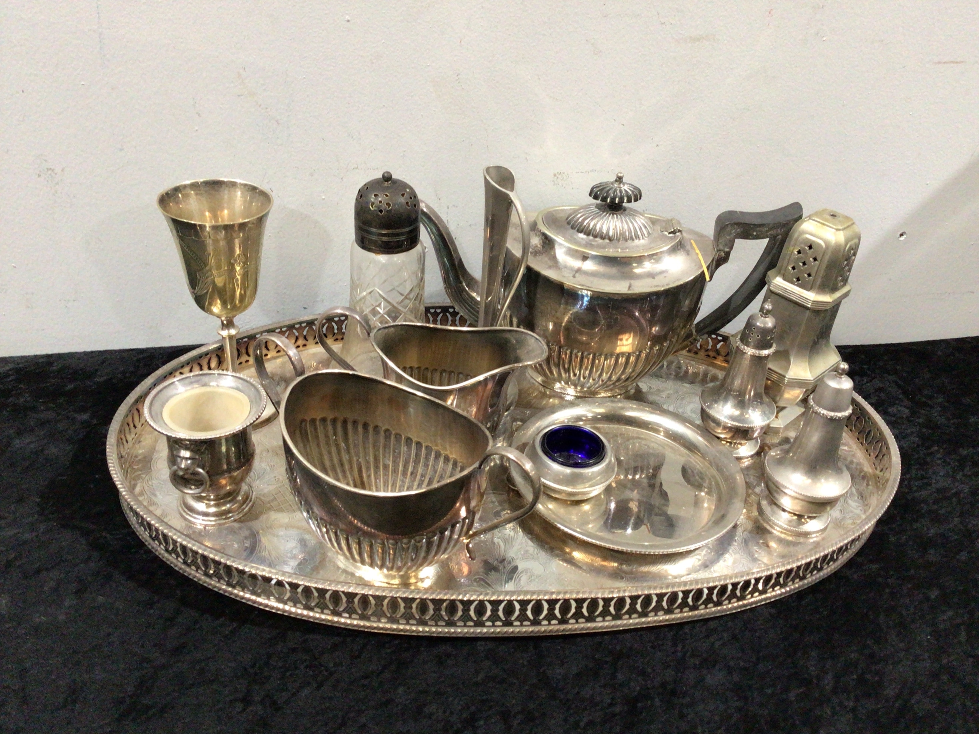A collection of twelve silver-toned metal tableware pieces including a tea service, condiment set, and oval serving tray, along with a single gold-toned metal goblet.