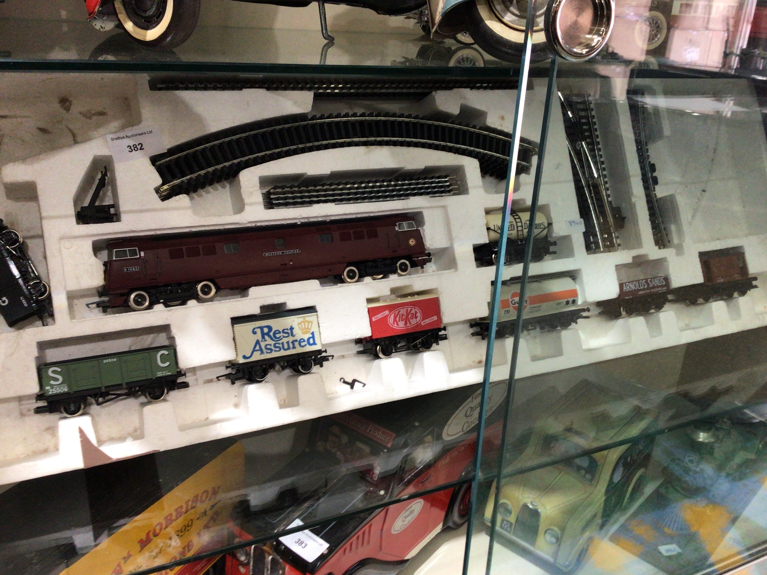 A collection of model railway items including one dark red locomotive marked ‘WESTERN REGION’ and ‘W.R. 47000’, five wagons (green ‘S 25550’, black ‘Rest Assured’, red ‘Kit Kat’, grey ‘BP 72900’, dark brown ‘ARNOLDS SANDS LEICESTER’), and several sections of black track.