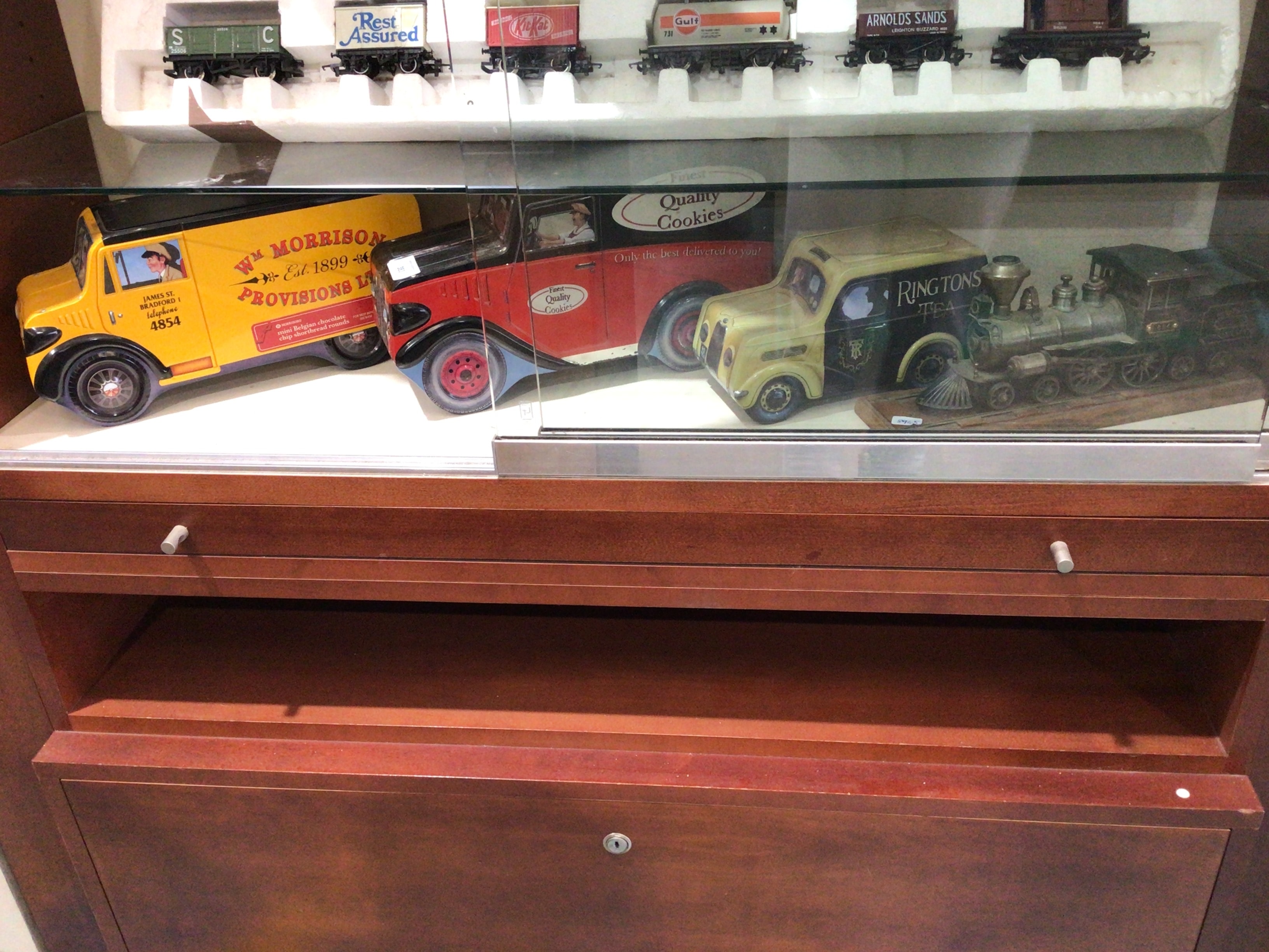 A red and black collectible delivery van model/tin, inscribed ‘Quality Cookies’, ‘Only the best delivered to your door!’, and ‘Finest Quality Cookies’.