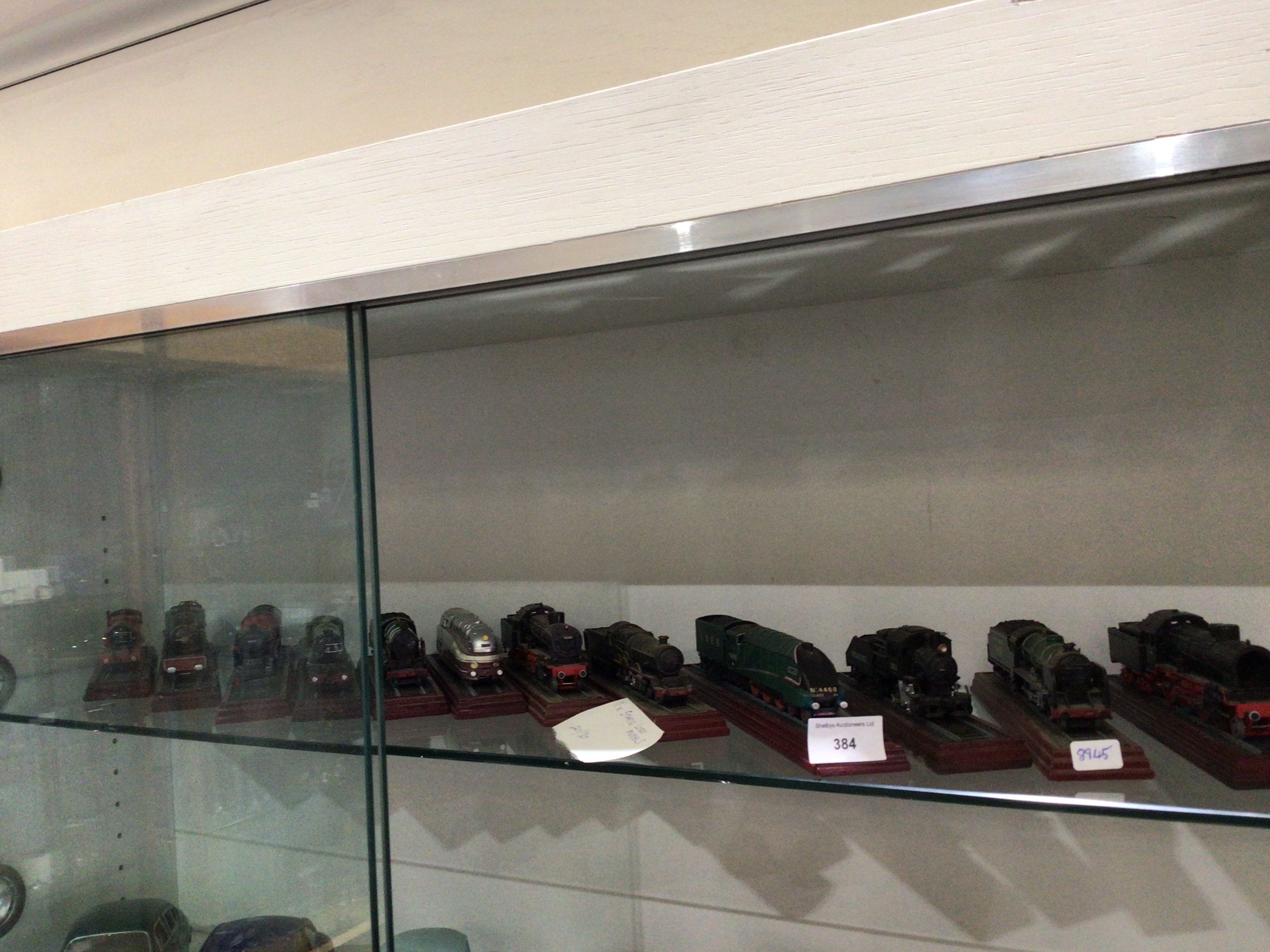 Eleven static model train locomotives, including one dark green example with red wheels/undercarriage, black details, and ‘N:4468’ on its side.