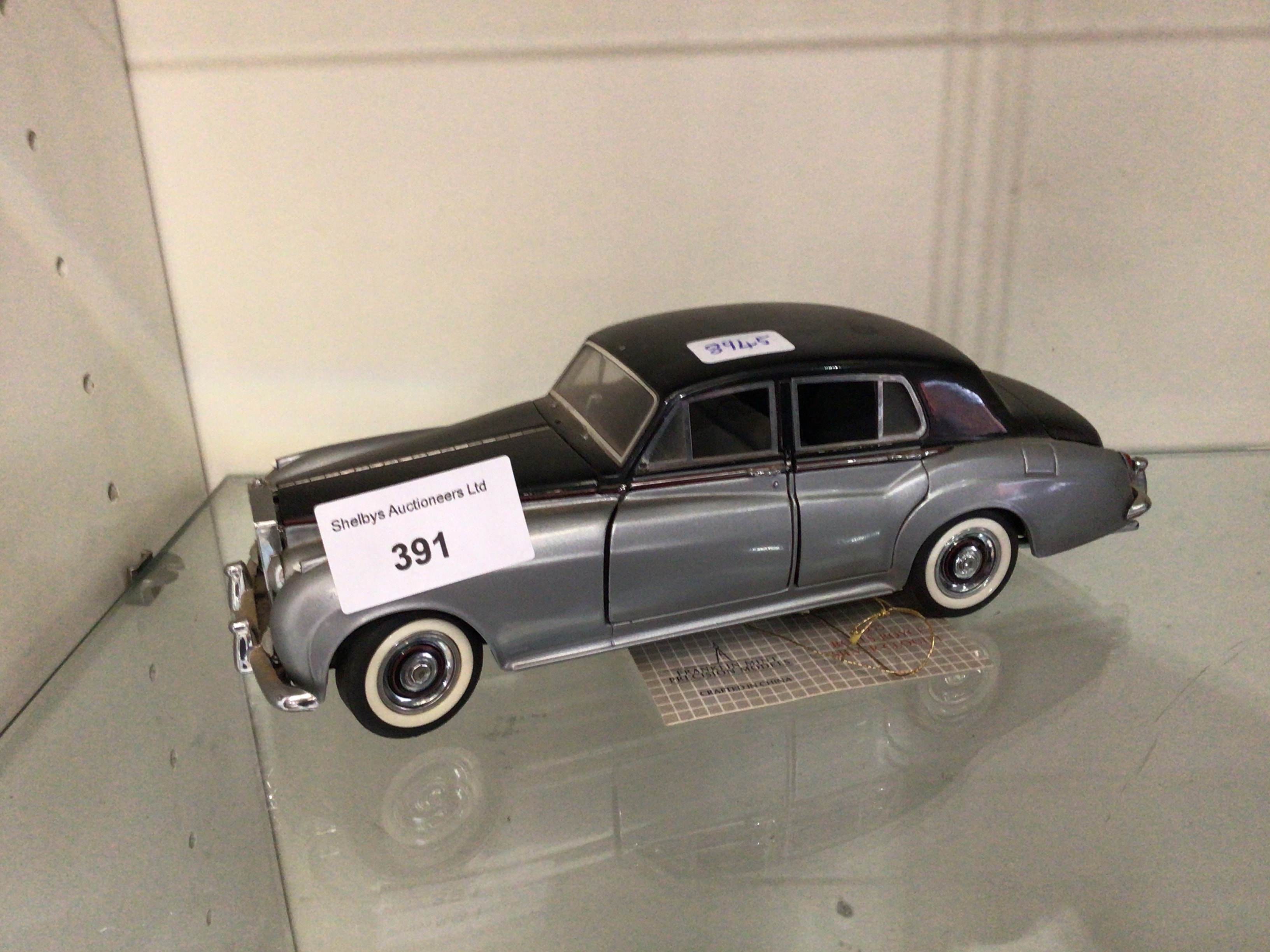 A black and silver/grey Franklin Mint 1:24 scale model car, a 1955 Rolls-Royce Silver Cloud I, with white-wall tires.