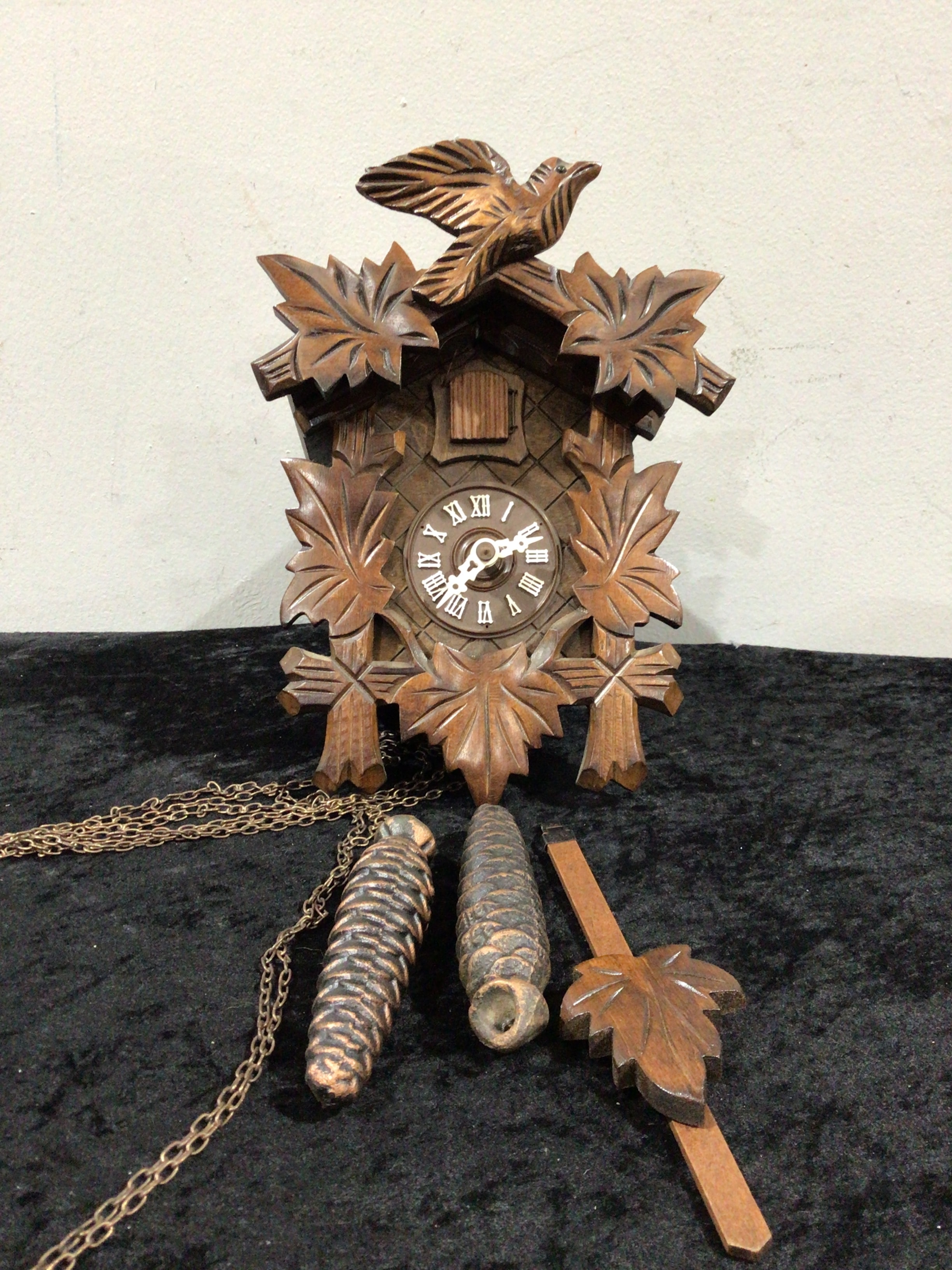 A brown carved wooden cuckoo clock with a bird on top and leaf decorations, a white clock face displaying Roman numerals (I-XII), accompanied by two pinecone weights on chains and a leaf-carved wooden pendulum.