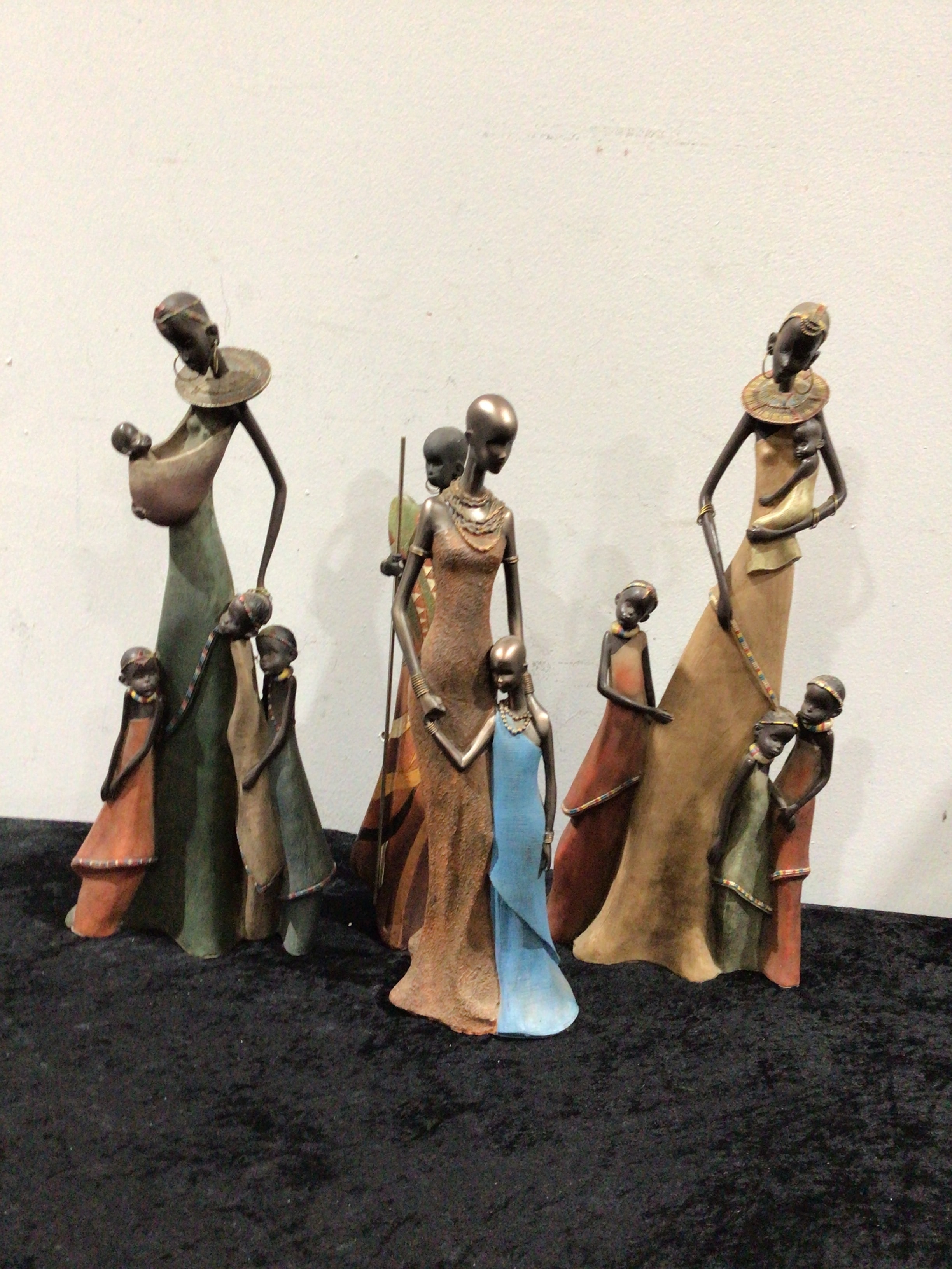 Three African-style decorative sculptures depicting a total of ten figures comprising adult women, babies, and children, adorned in varied earthy tones of dark green, rust, tan, and orange with metallic gold/bronze accents.