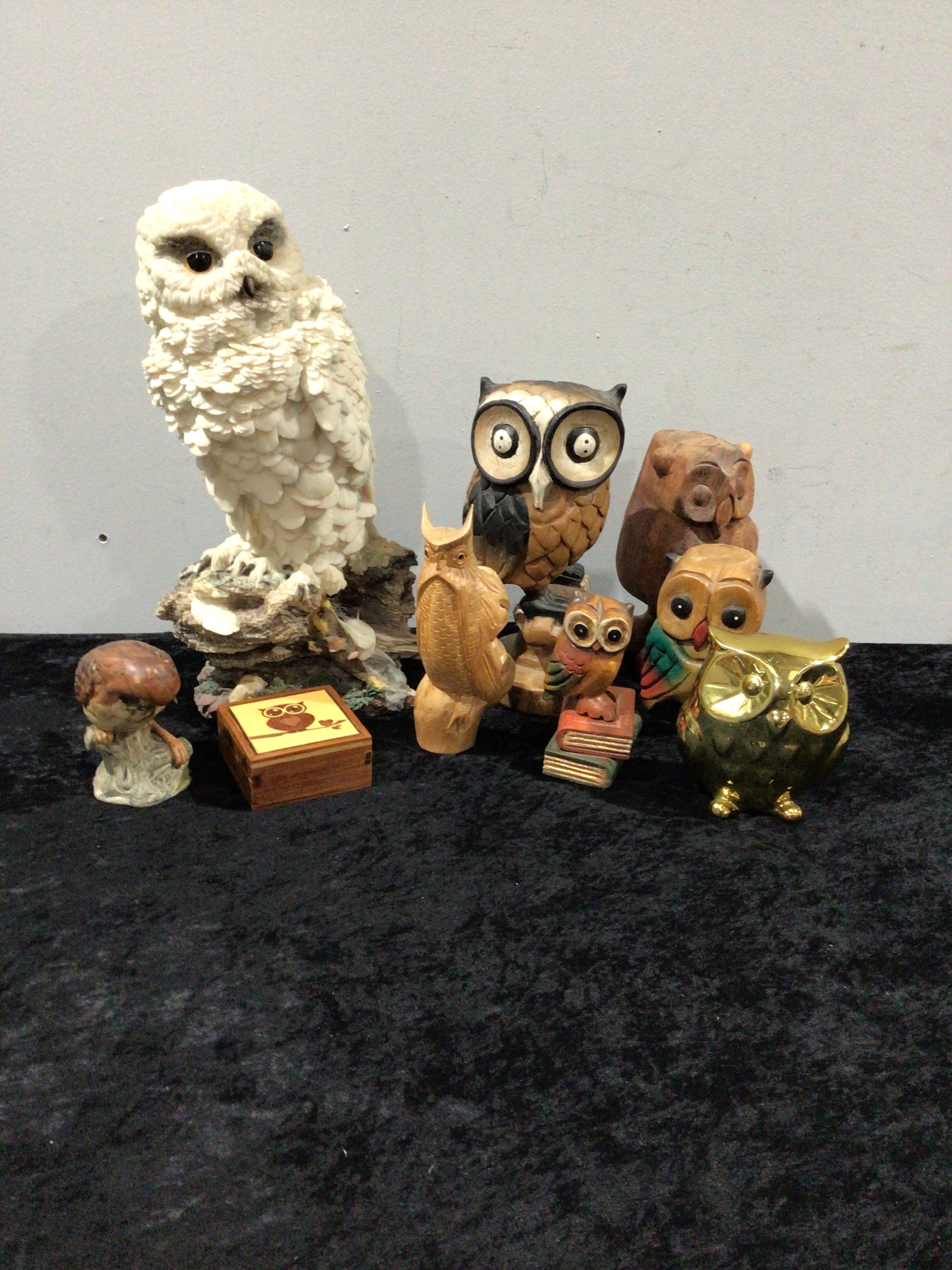 A collection of eight decorative items including one large white ceramic owl figurine, four carved wooden owl figurines, one small golden owl figurine, a small wooden box with an owl inlay, and one mushroom-shaped figurine.