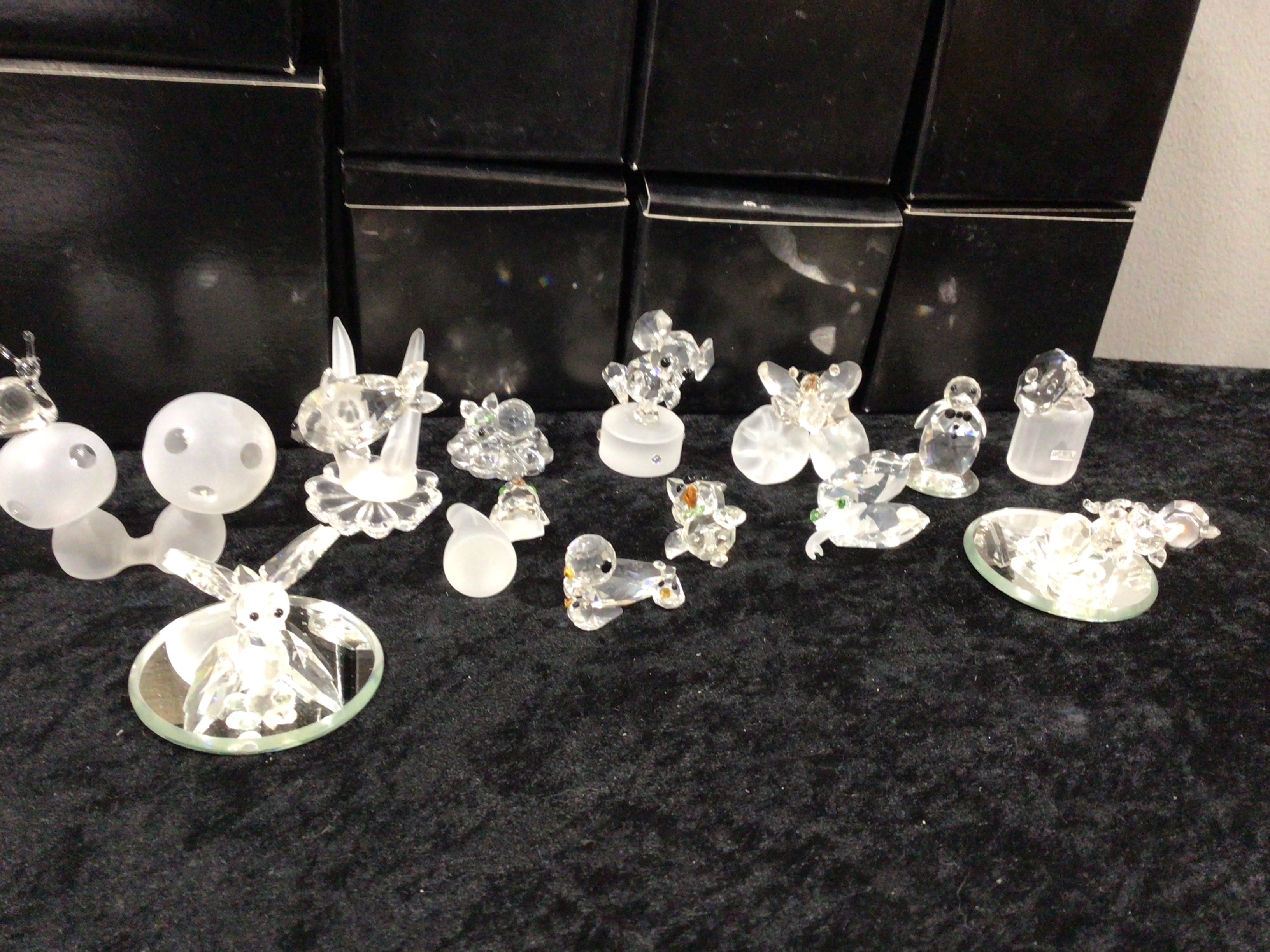 A lot comprising approximately fifteen clear and frosted glass/crystal animal and abstract-form figurines, including rabbits, birds, butterflies, and a snail, with some featuring minimal colored accents and others resting on mirrored or frosted bases.