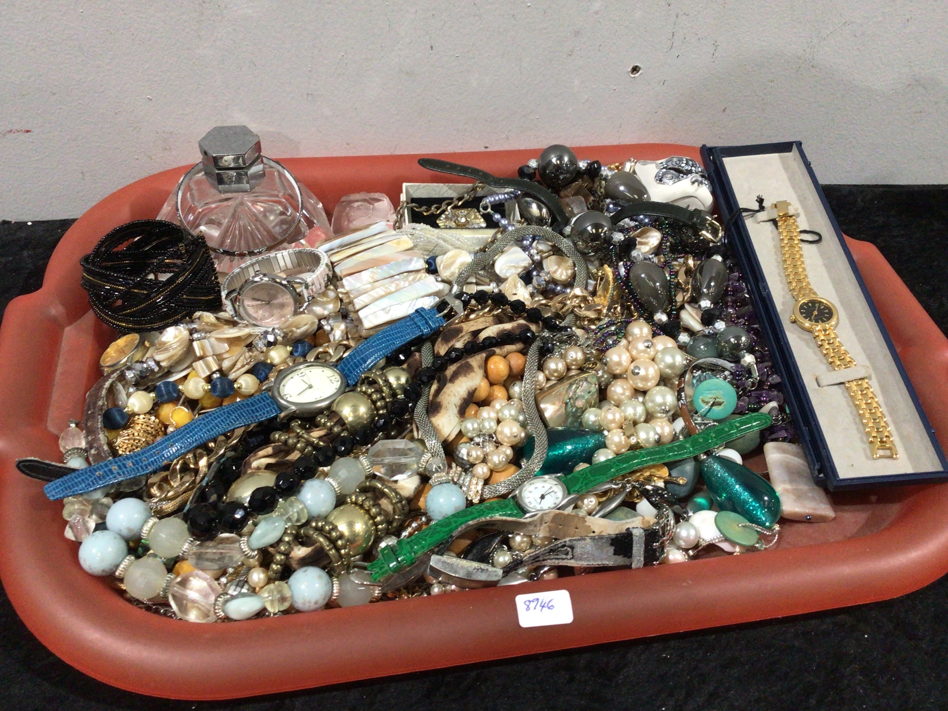 A large collection of assorted costume jewelry, including numerous necklaces and bracelets in colors such as gold, silver, black, white, blue, green, pink, and brown, plus four watches and a clear glass perfume bottle.