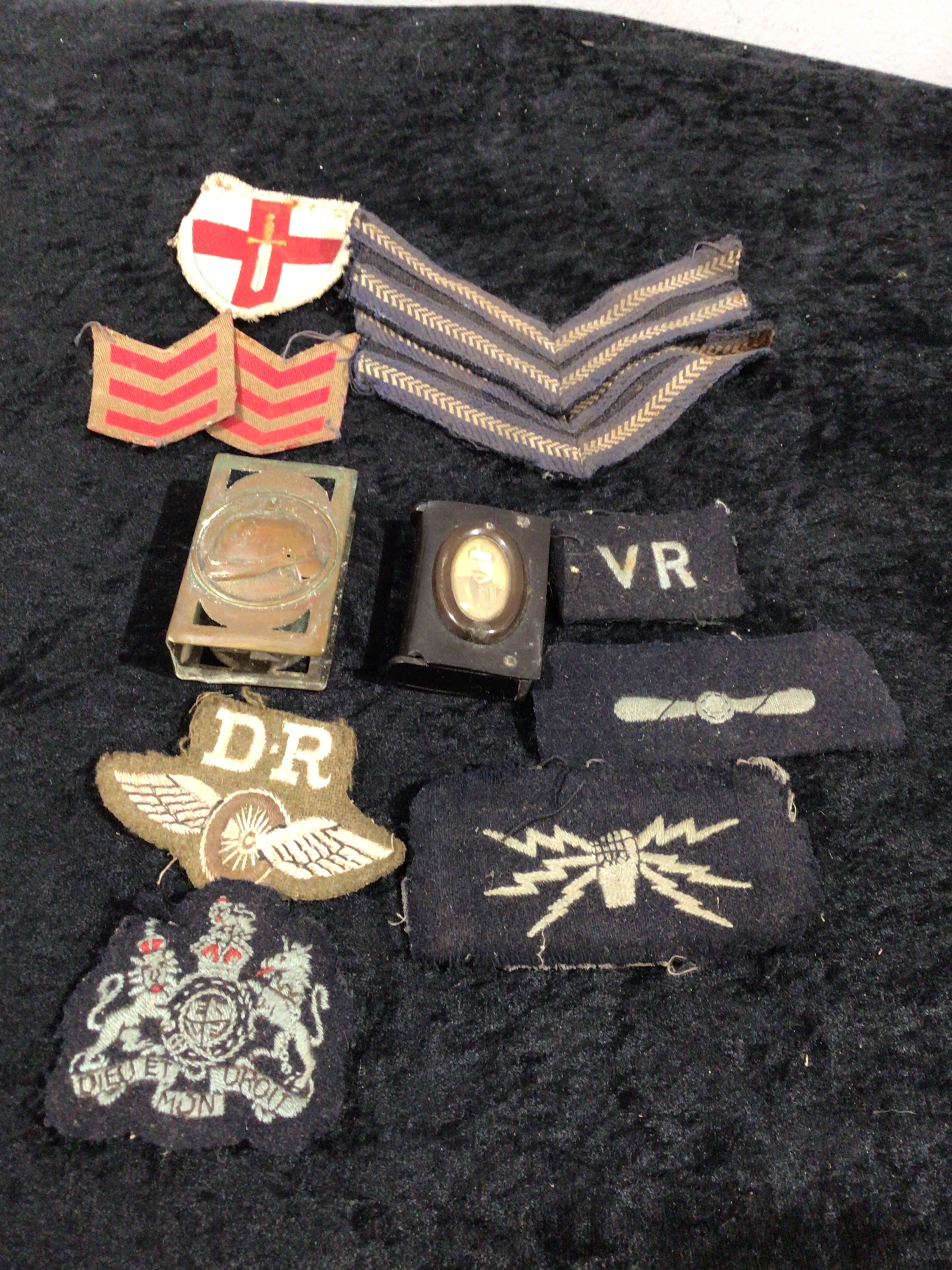 A collection of ten diverse military fabric patches and two small metal instruments, featuring various insignia and embroidered text including ‘VR’, ‘DR’, and ‘DIEU ET MON DROIT’.