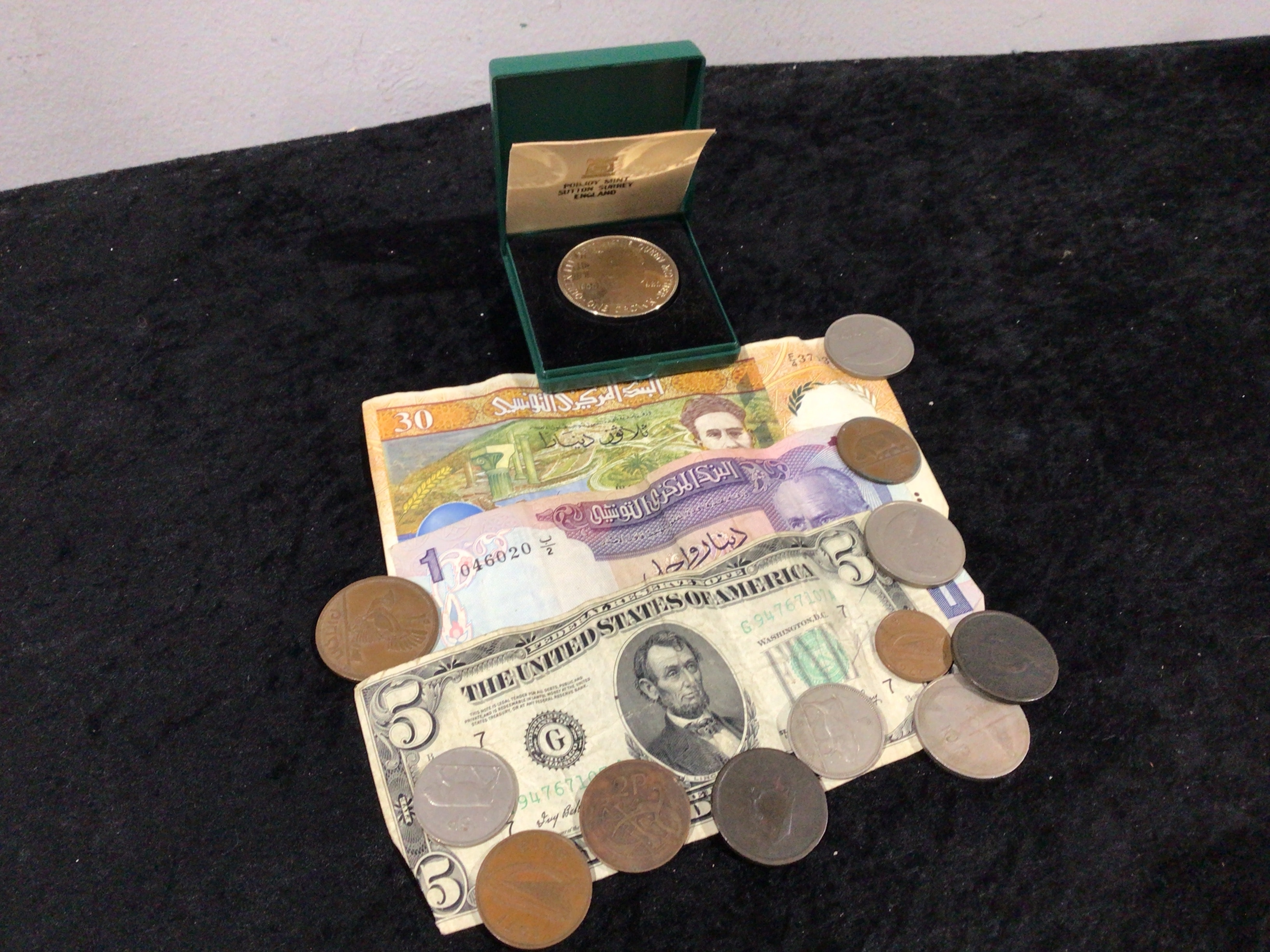 A bronze-colored Queen Elizabeth II 1977 Jubilee medal in a green velvet Polroy Mint box, three banknotes including Iraqi Dinars and a US $5 bill, and a collection of twelve assorted silver and bronze-colored coins.