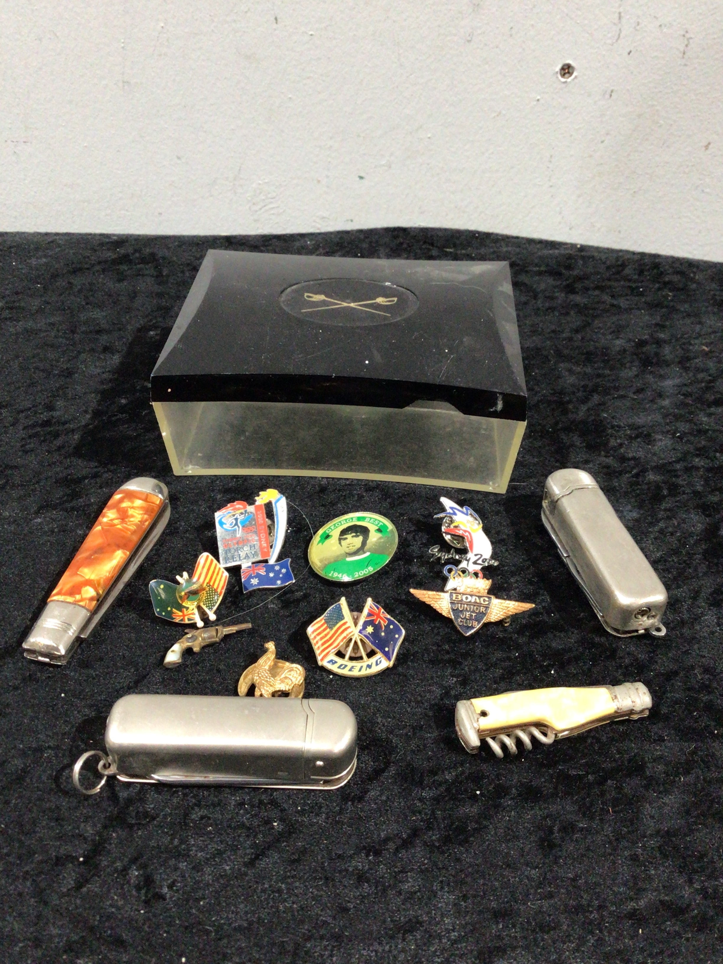 A black and clear plastic storage box with a crossed swords emblem, approximately ten collectible pins including “GEORGE BEST 1946 – 2005”, “BOEING”, “BOAC JUNIOR JET CLUB”, and “Sydney 2000”, two silver-toned rectangular multi-tools or lighters, an orange marbled pocket knife, and a yellow-handled multi-tool with a corkscrew.