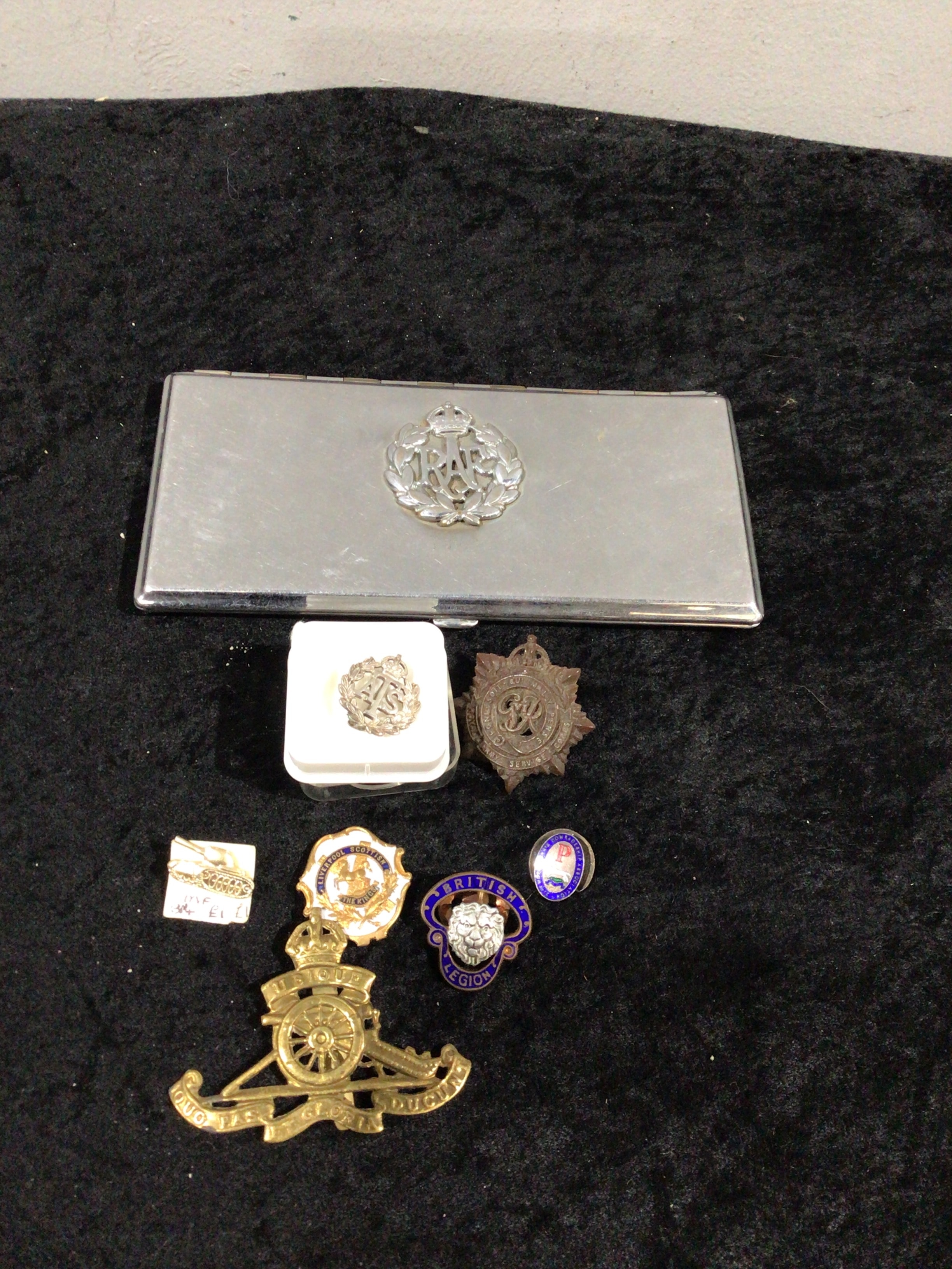 A silver-colored cigarette case with an RAF badge, a gold-colored tank brooch, and multiple military and veteran organization badges including ATS, ROYAL ARMY SERVICE CORPS GR, LIVERPOOL SCOTTISH THE KINGS, BRITISH LEGION, RBL, and QUO FAS ET GLORIA DUCUNT.