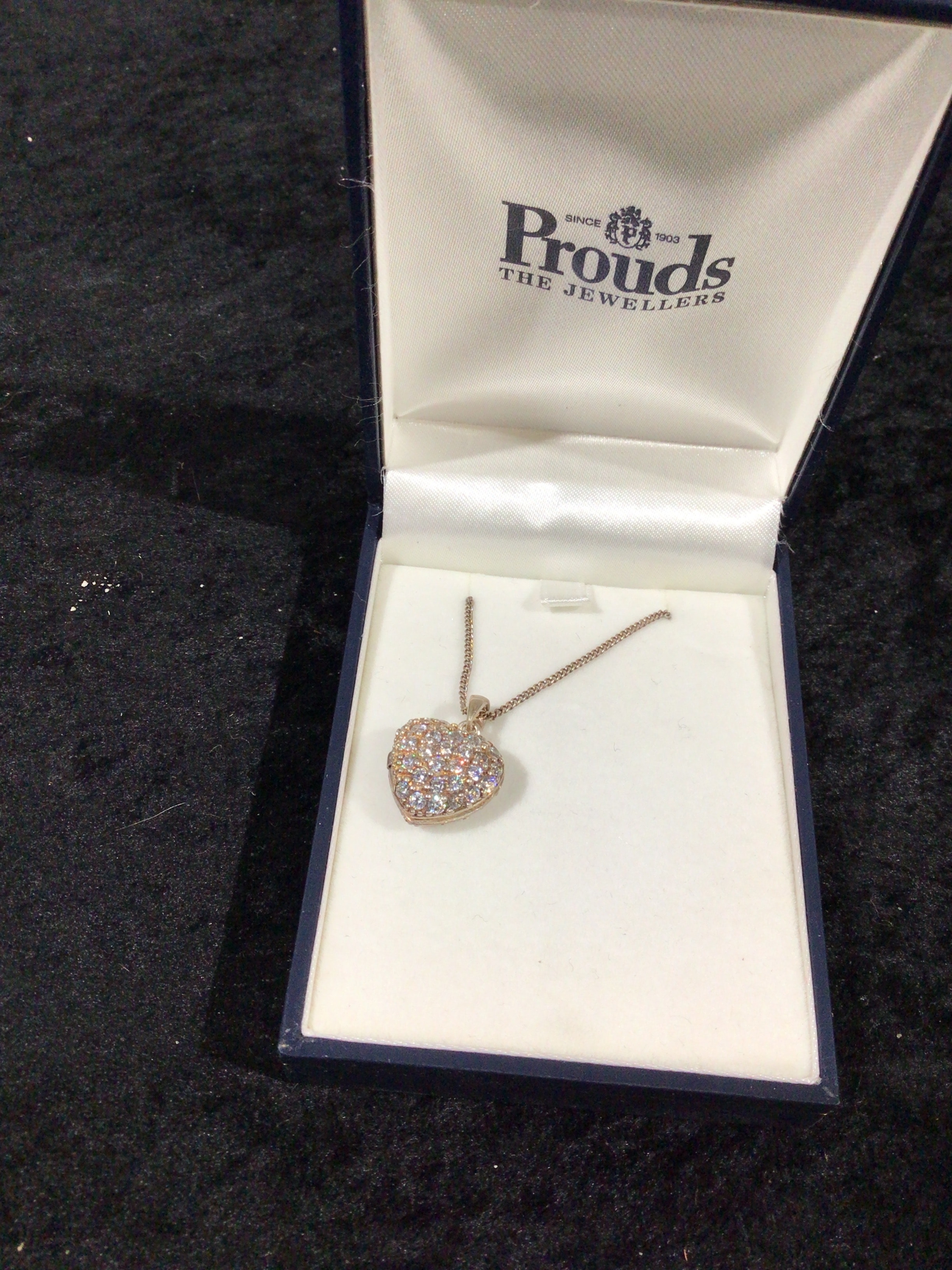A silver necklace with a heart-shaped, multi-stone diamanté locket pendant, presented in its original Prouds branded box.