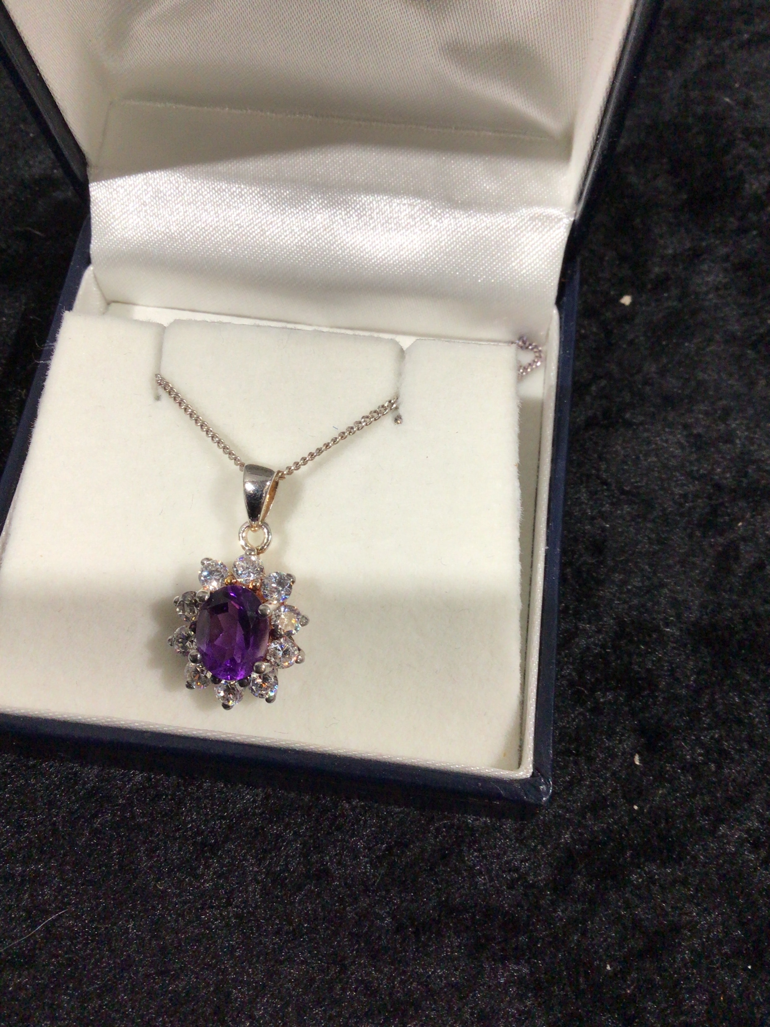 A silve necklace features a pendant with a large oval purple gemstone surrounded by smaller clear gemstones, displayed in a white-lined blue box.