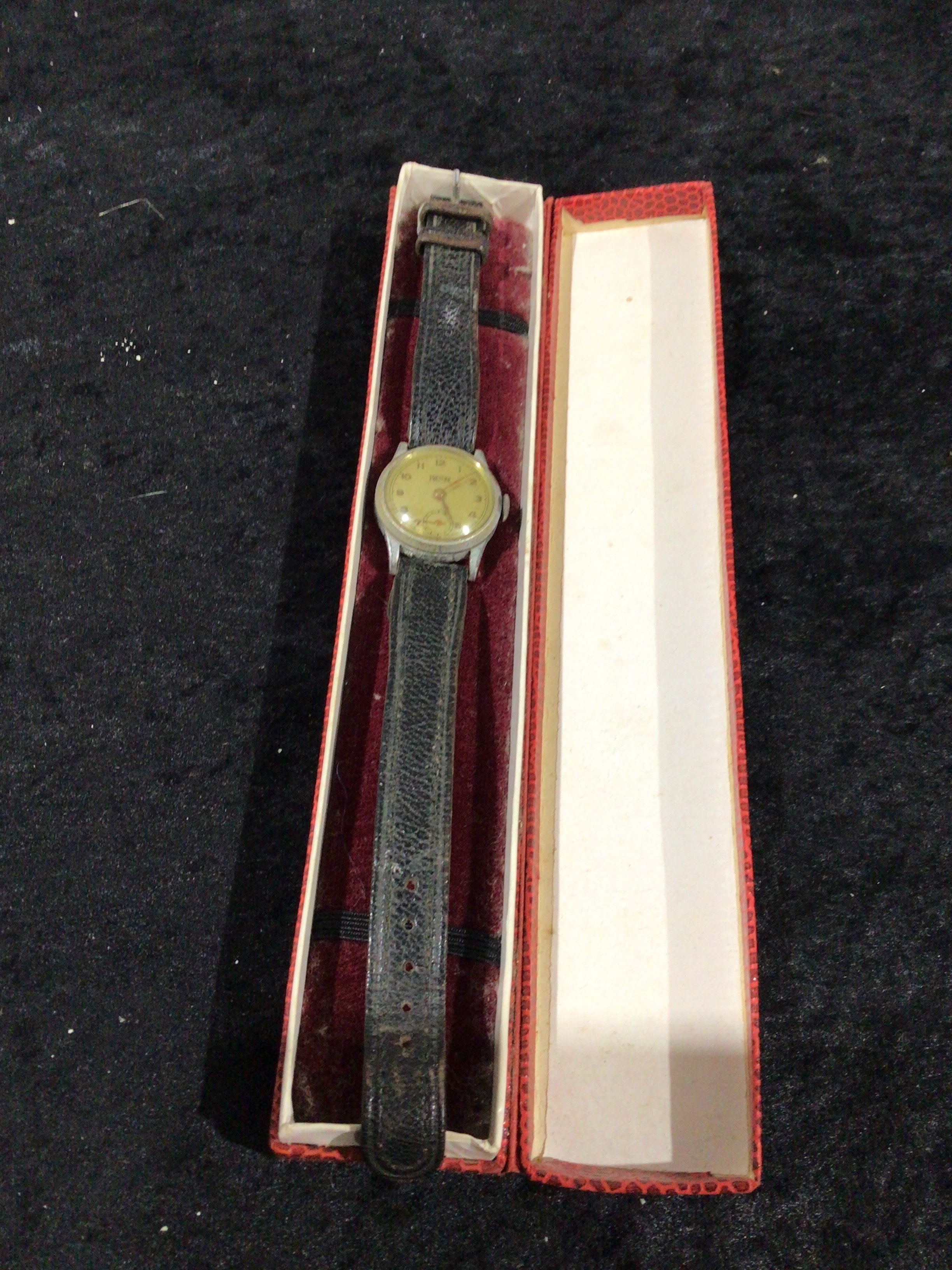 A silver-tone wristwatch with a yellow/gold face marked “Pobeda” and “15 Jewels”, featuring a black strap and housed in a red and white box.