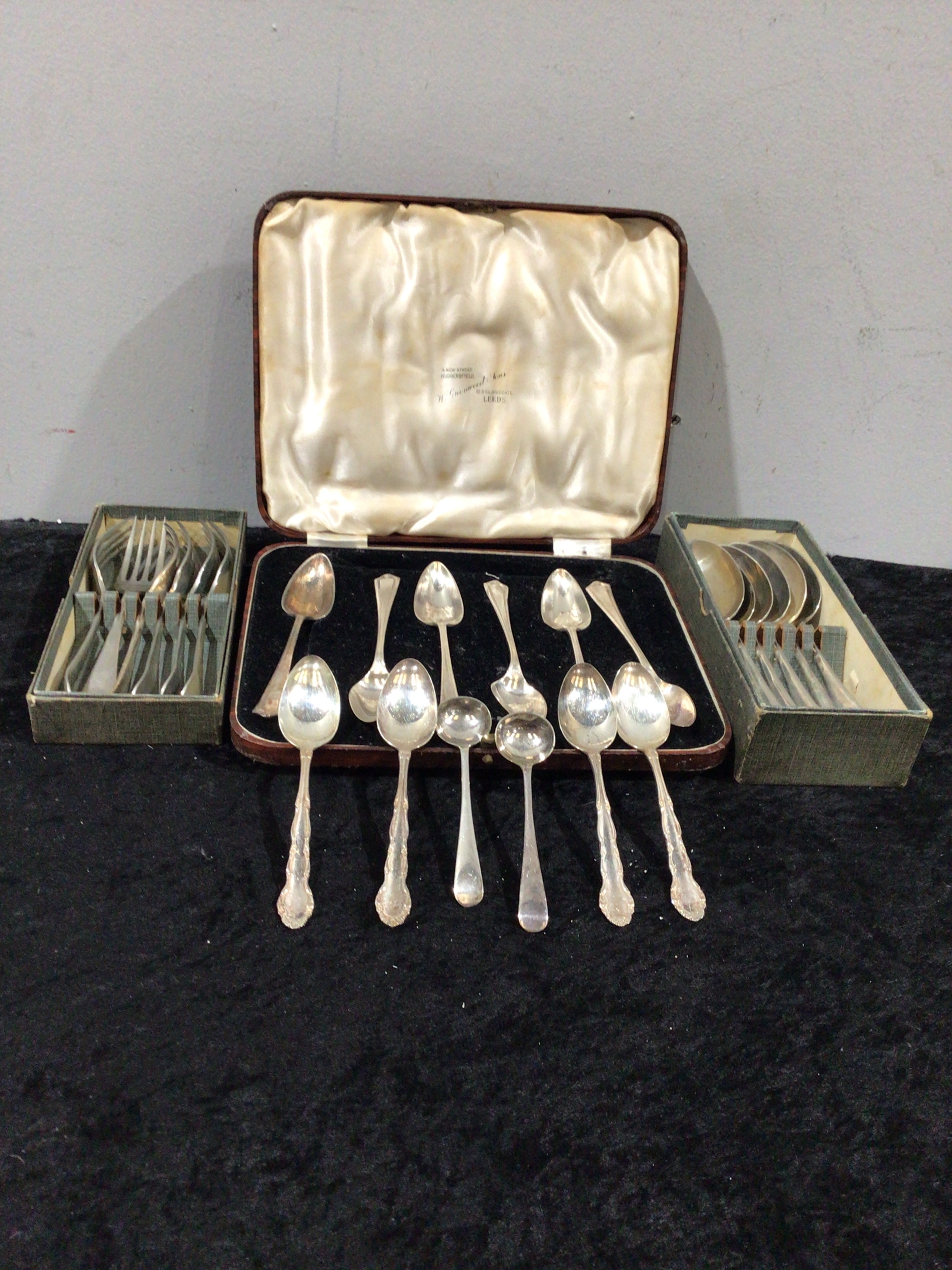 Approximately 16 silver-colored spoons, some with ornate handles, displayed within and around an open brown presentation case with a cream satin interior, inscribed ‘M. GREENWOOD & SONS, A NEW STREET HUDDERSFIELD, 53 BRIGGATE LEEDS’.