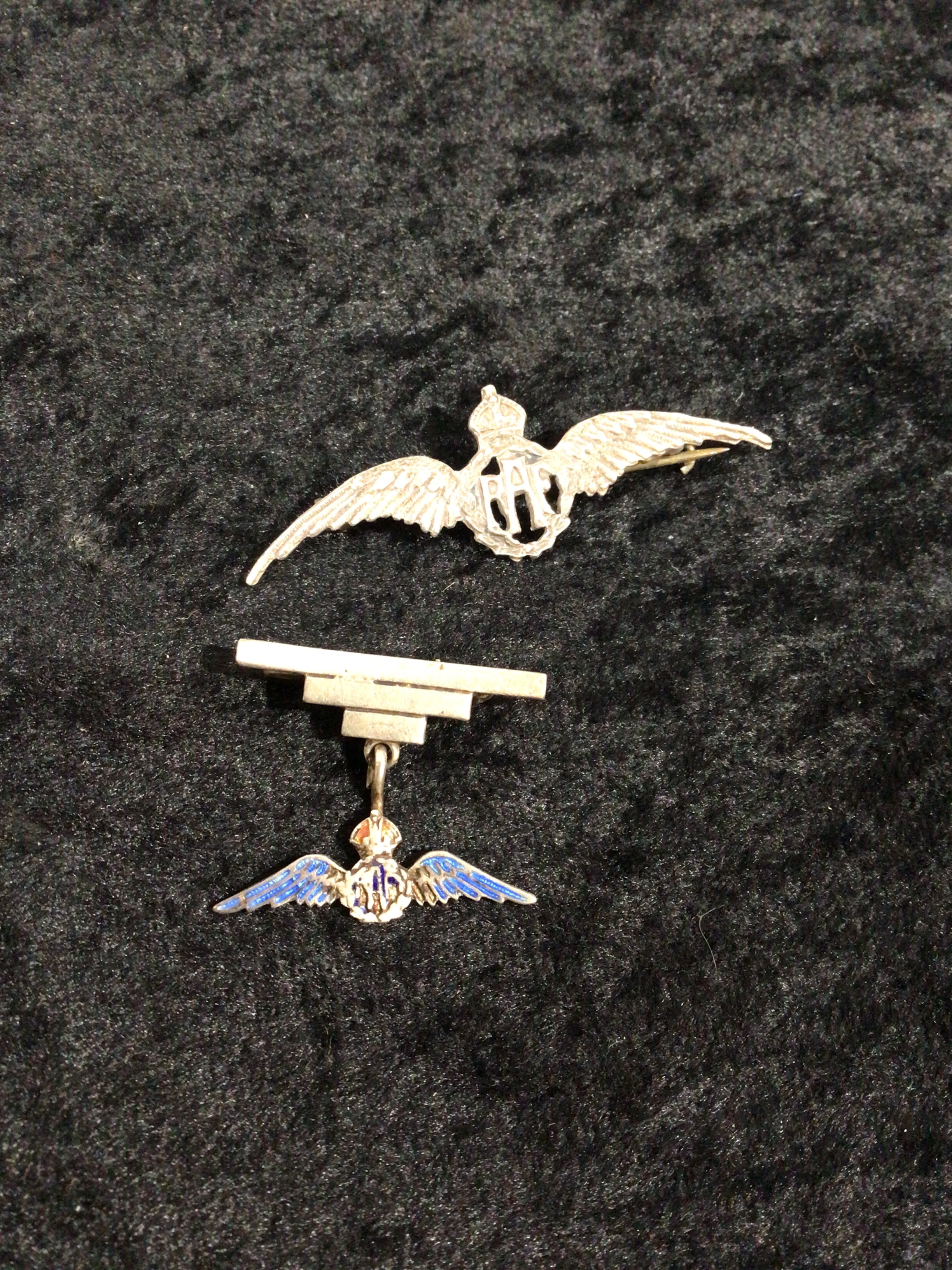 Two Sterling Silver Royal Air Force (RAF) wings badges, one larger with ‘RAF’ under a crown, and one smaller enameled with blue and red details, also displaying ‘RAF’ under a crown, attached to a bar.