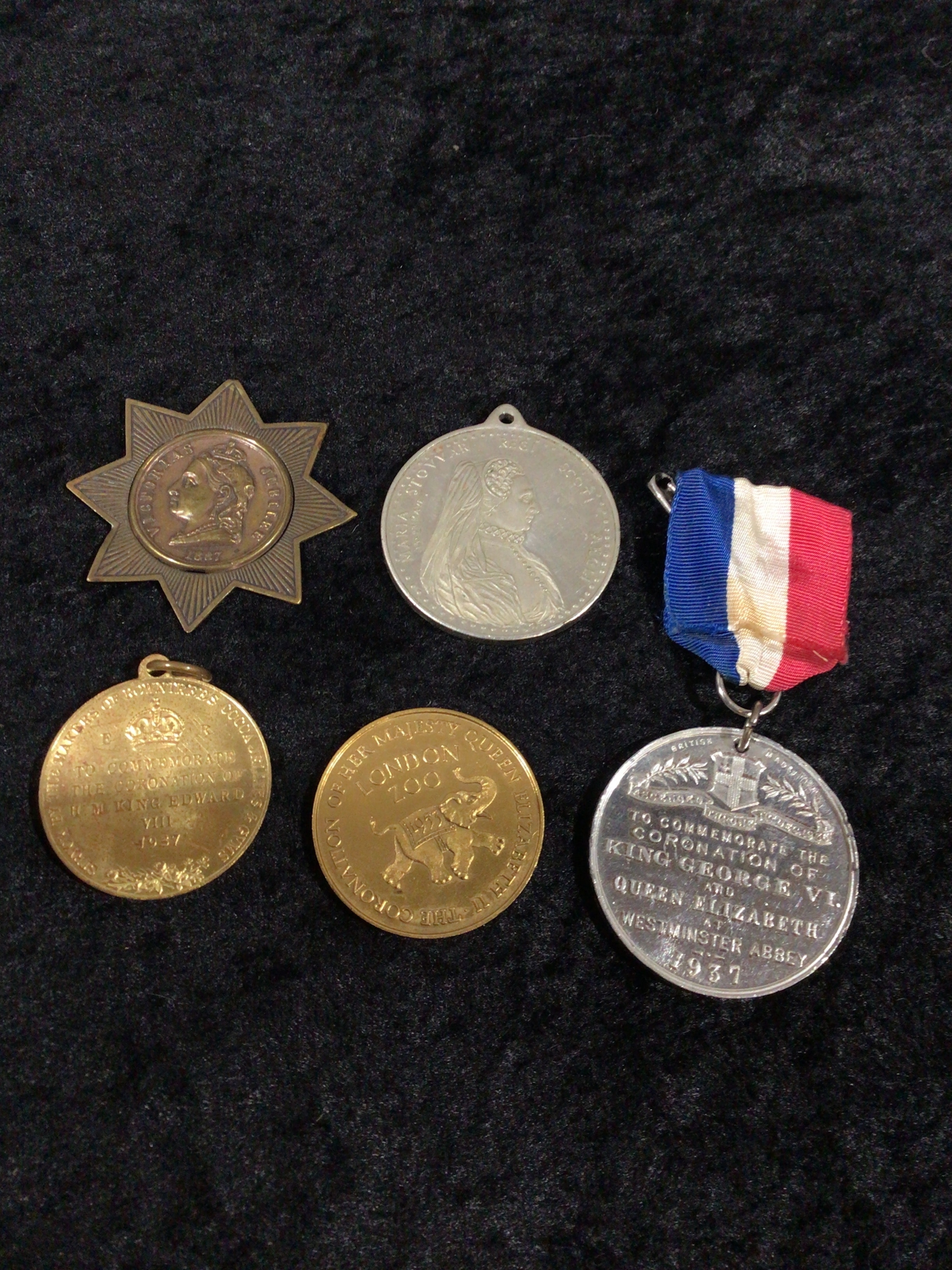 A group of five commemorative medals, including Queen Victoria Jubilee, Mary Queen of Scots, King Edward VIII, King George VI, and Queen Elizabeth II London Zoo.