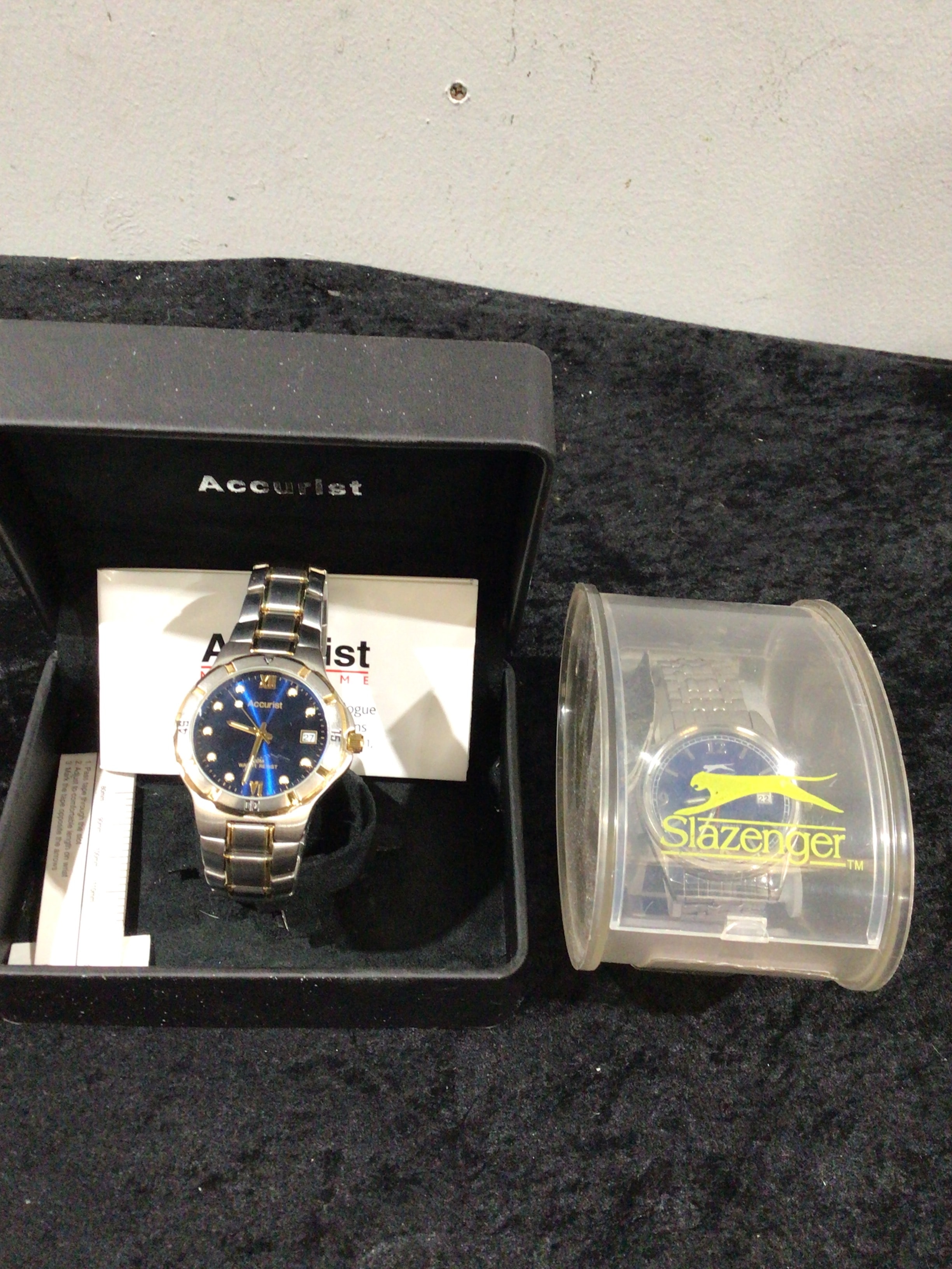 Two watches, including one Accurist silver and gold-tone with a blue dial marked “Accurist” and “WATER RESIST” in its black box, and one silver-tone Slazengerâ„¢ with a blue dial displaying its logo and name in a clear plastic case.