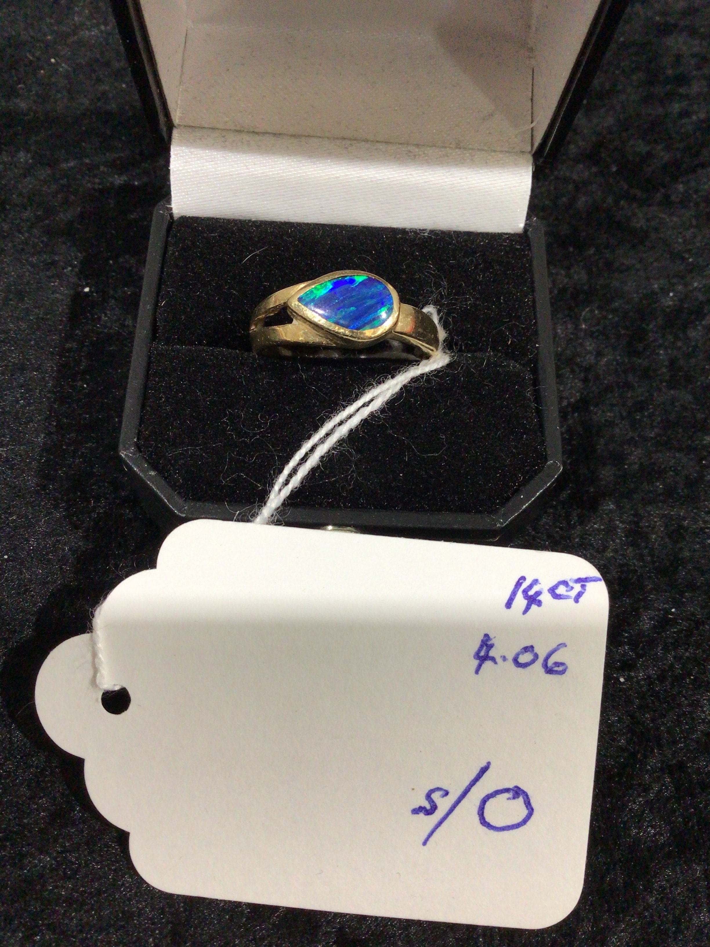 A 14ct gold ring featuring a blue and green teardrop-shaped opal, with an attached label stating ‘4.06’.