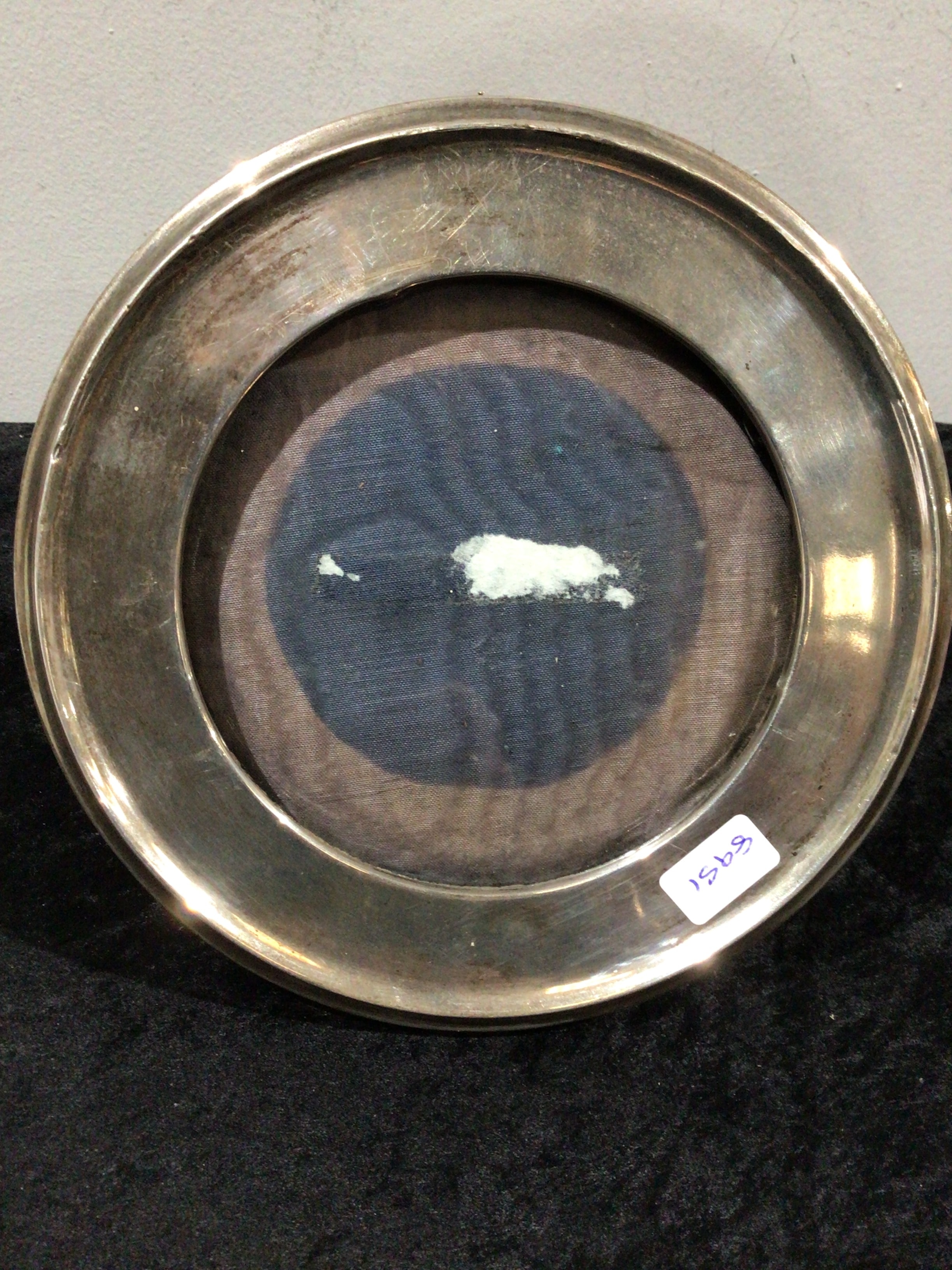 A round, silver-colored frame with a dark blue or black fabric-covered interior.
