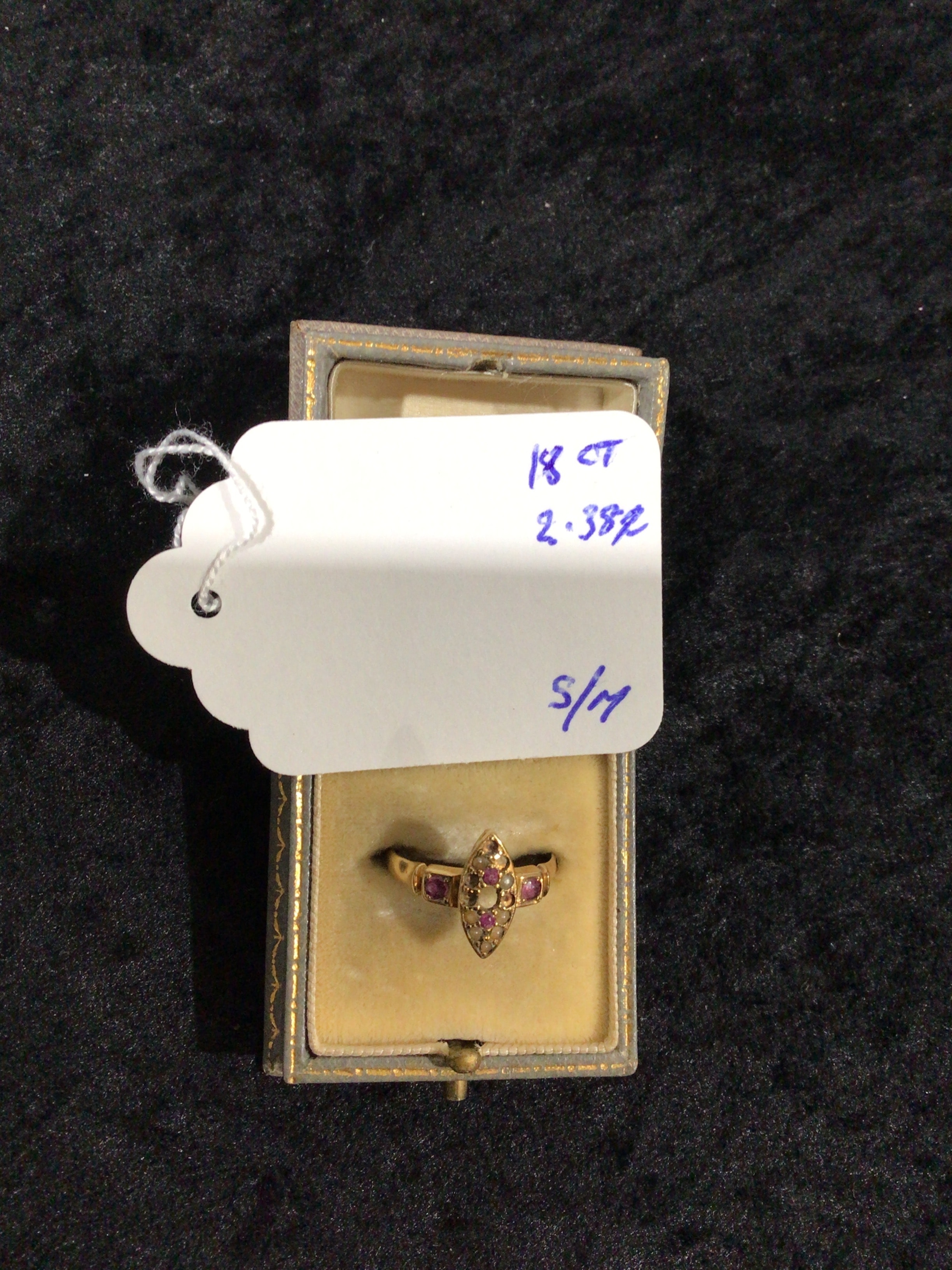 A gold-toned ring, marked 18 CT and weighing 2.38g, adorned with ruby and seed pearl stones, displayed in a small jewelry box.