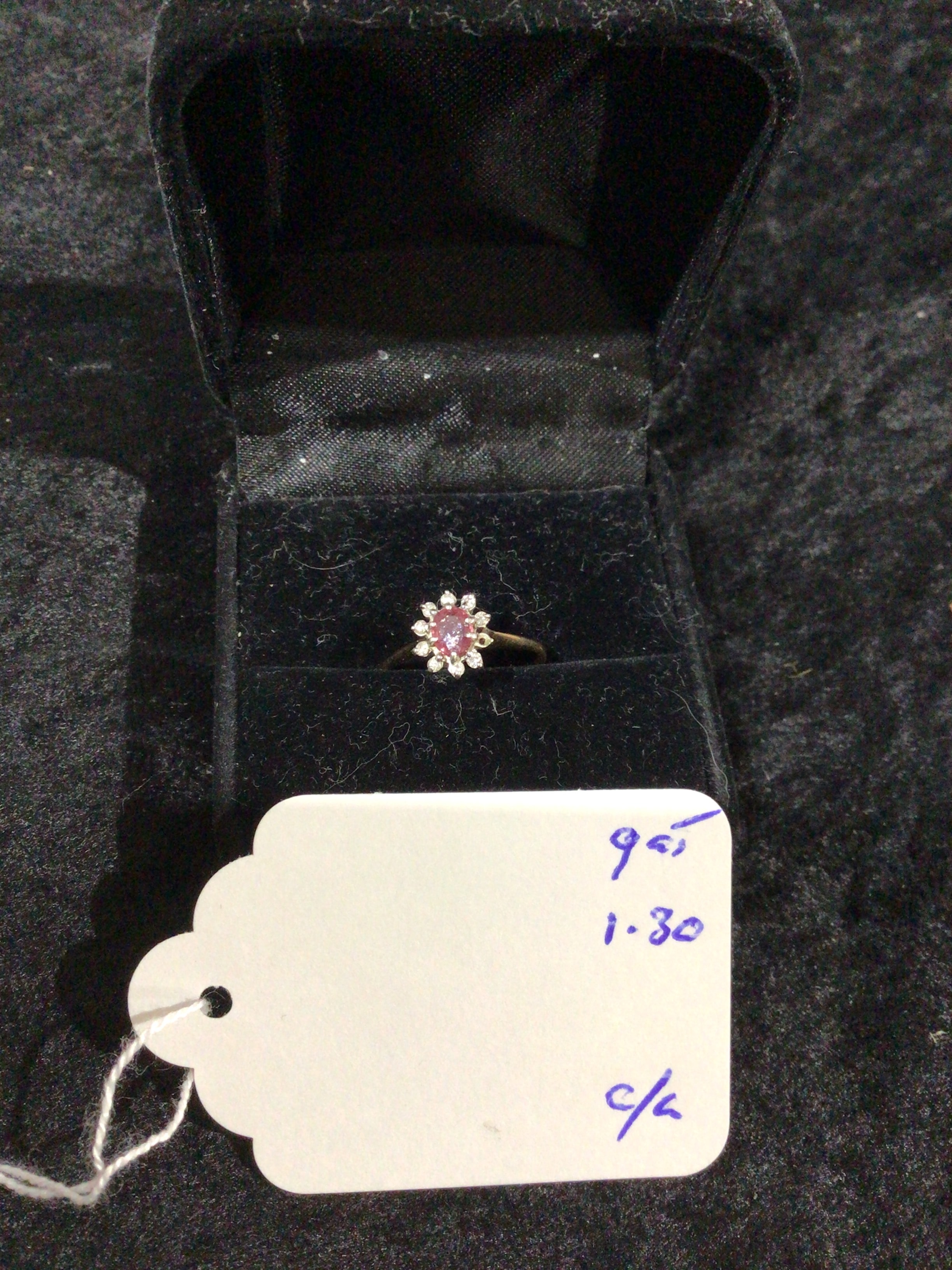 A 9ct yellow gold cluster ring featuring a central pink/red stone surrounded by clear/white stones, with a tag noting ‘1.30’, presented in a black velvet box.