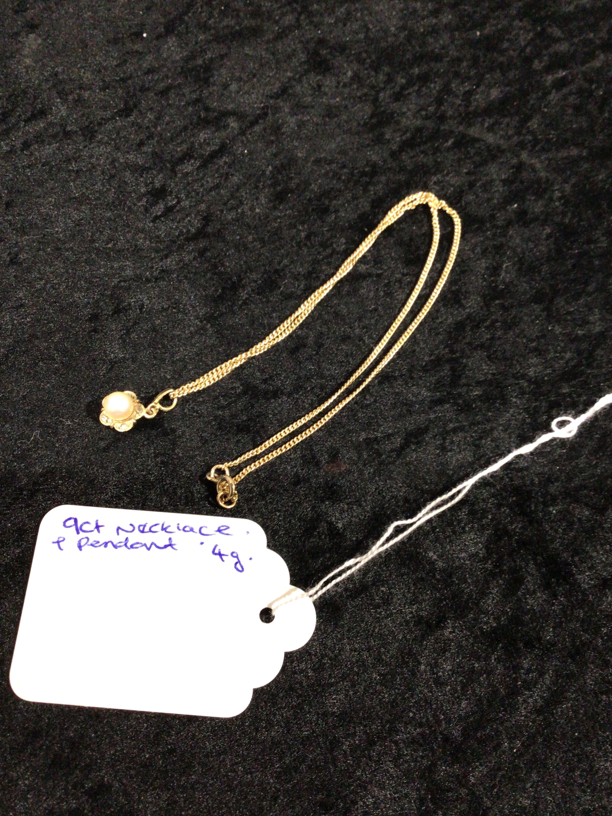 A 9ct gold-colored necklace with a pearl pendant, weighing 4g.
