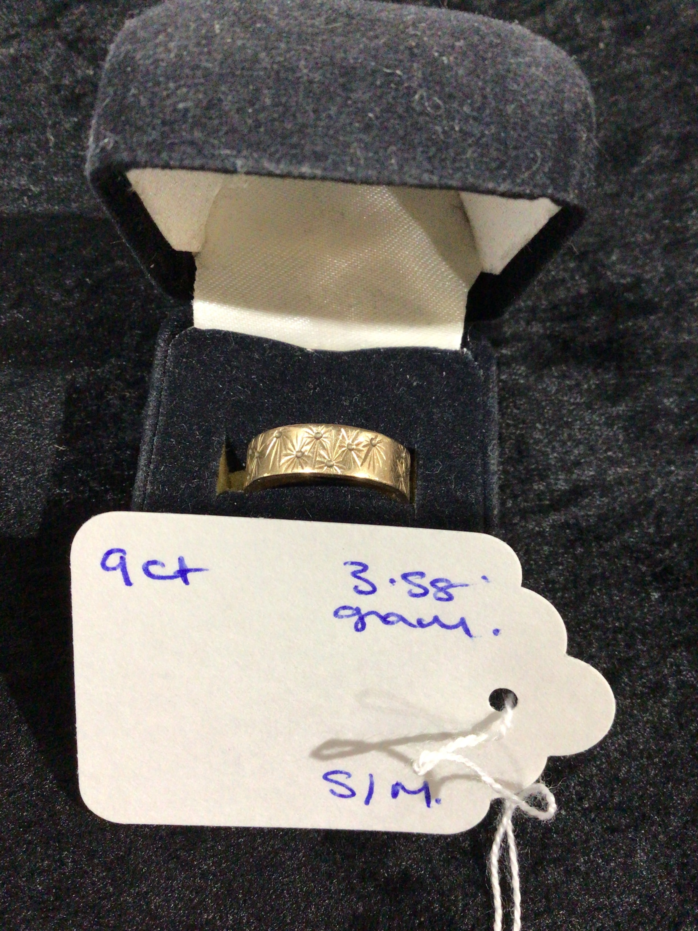A 9ct gold ring, weighing 3.58 grams, featuring an engraved star-like pattern, presented in a dark blue velvet box.