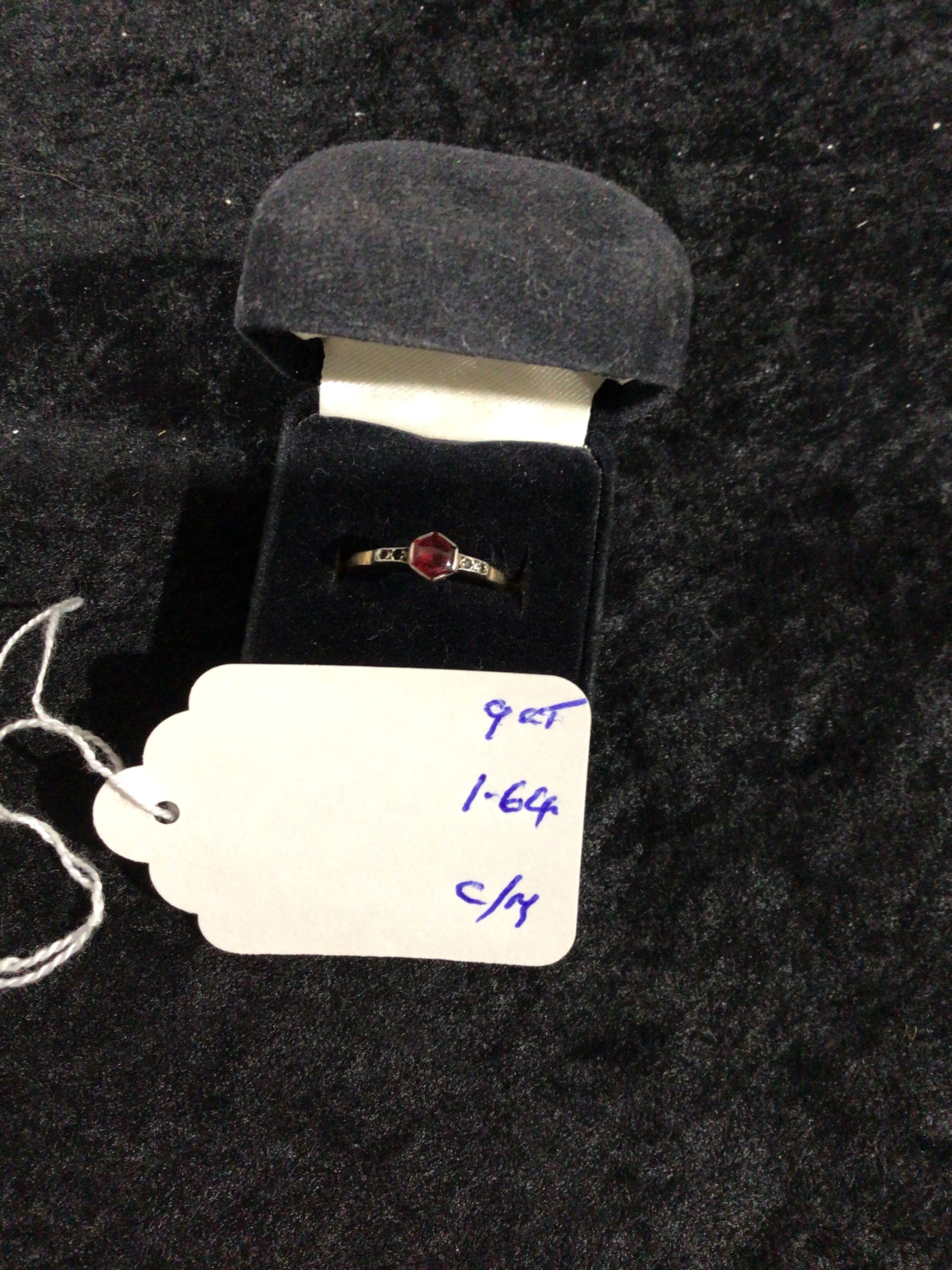 A 9 ct gold ring with a hexagonal red gemstone and clear side stones, weighing 1.64, presented in a dark velvet ring box.