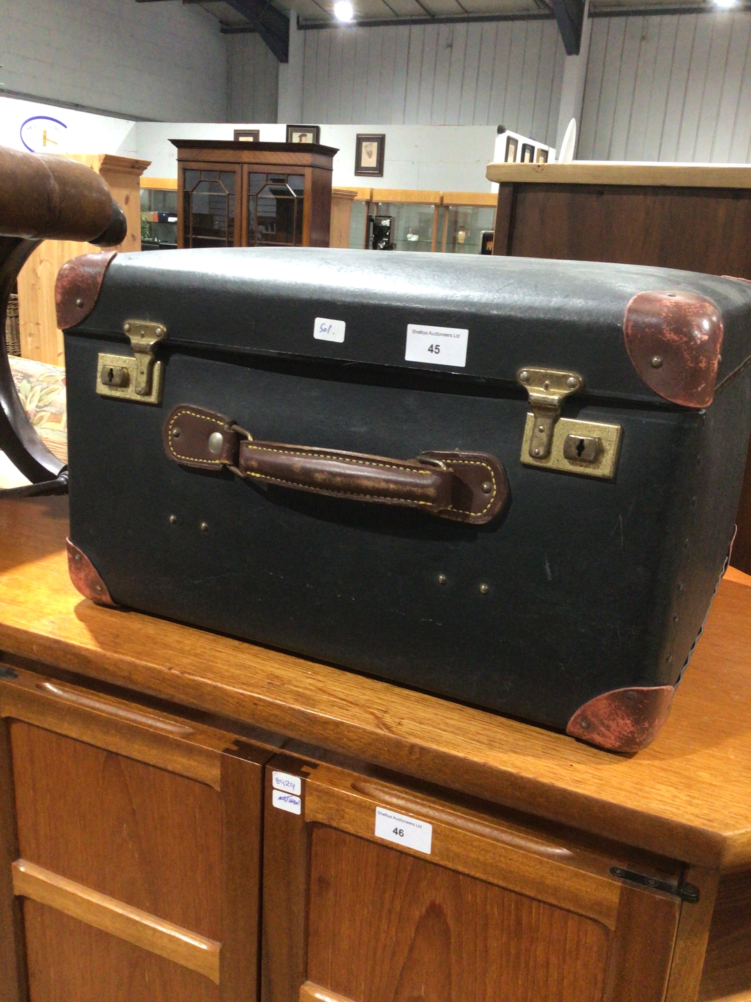 A single black suitcase or trunk with brown leather corner protectors and handle, and brass-colored latches.