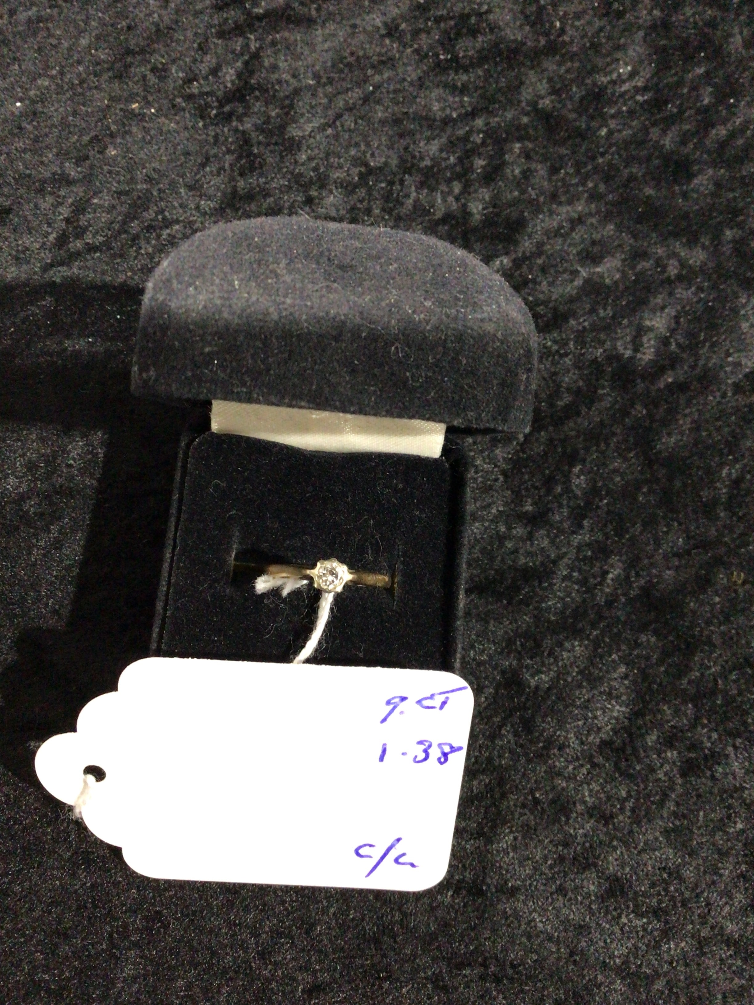 A gold 9ct gold ring featuring a clear/white diamond stone, presented in an open black velvet box.