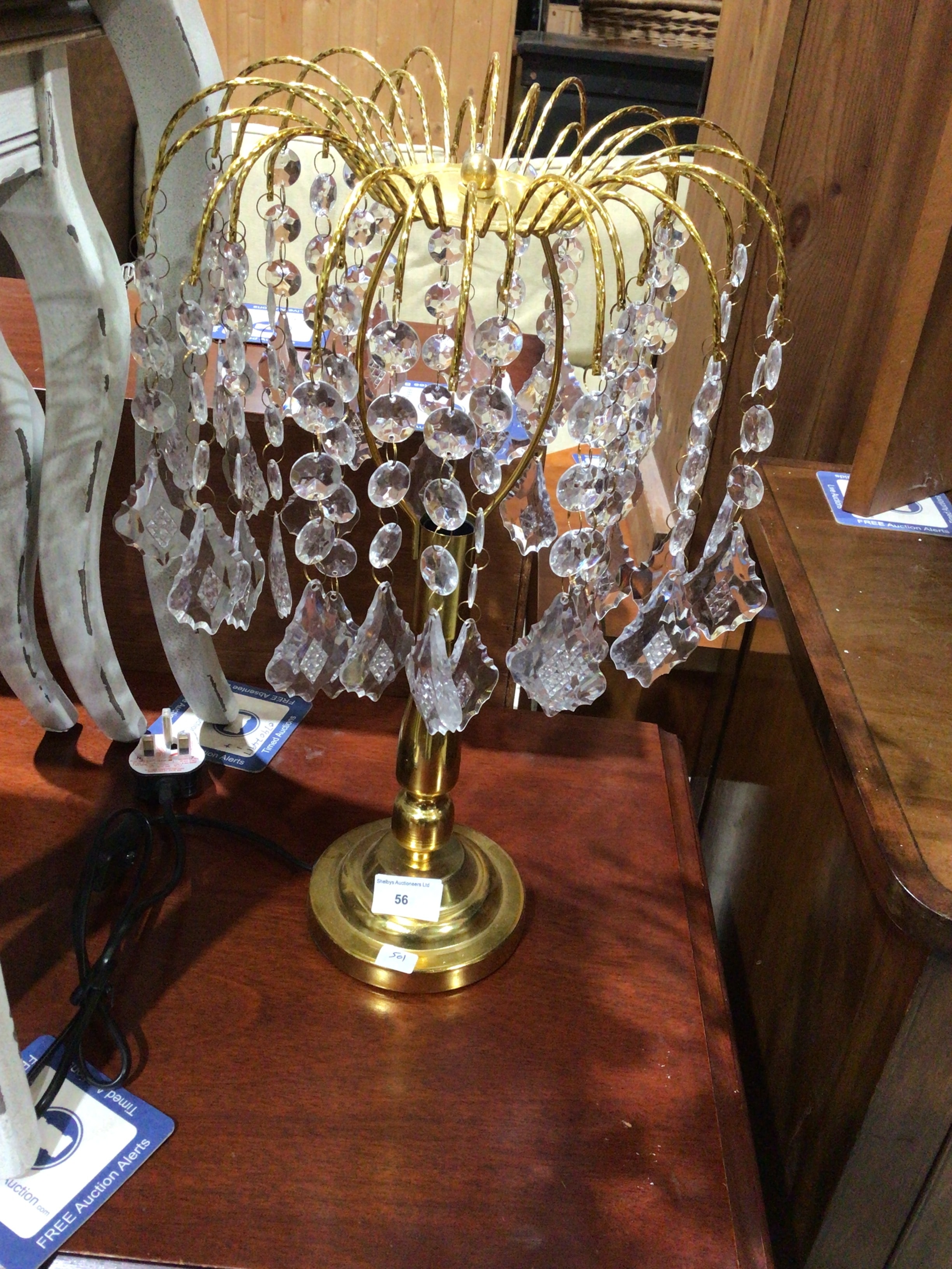 A single gold-colored chandelier-style table lamp with numerous clear crystal drops/prisms, featuring a label on its base.