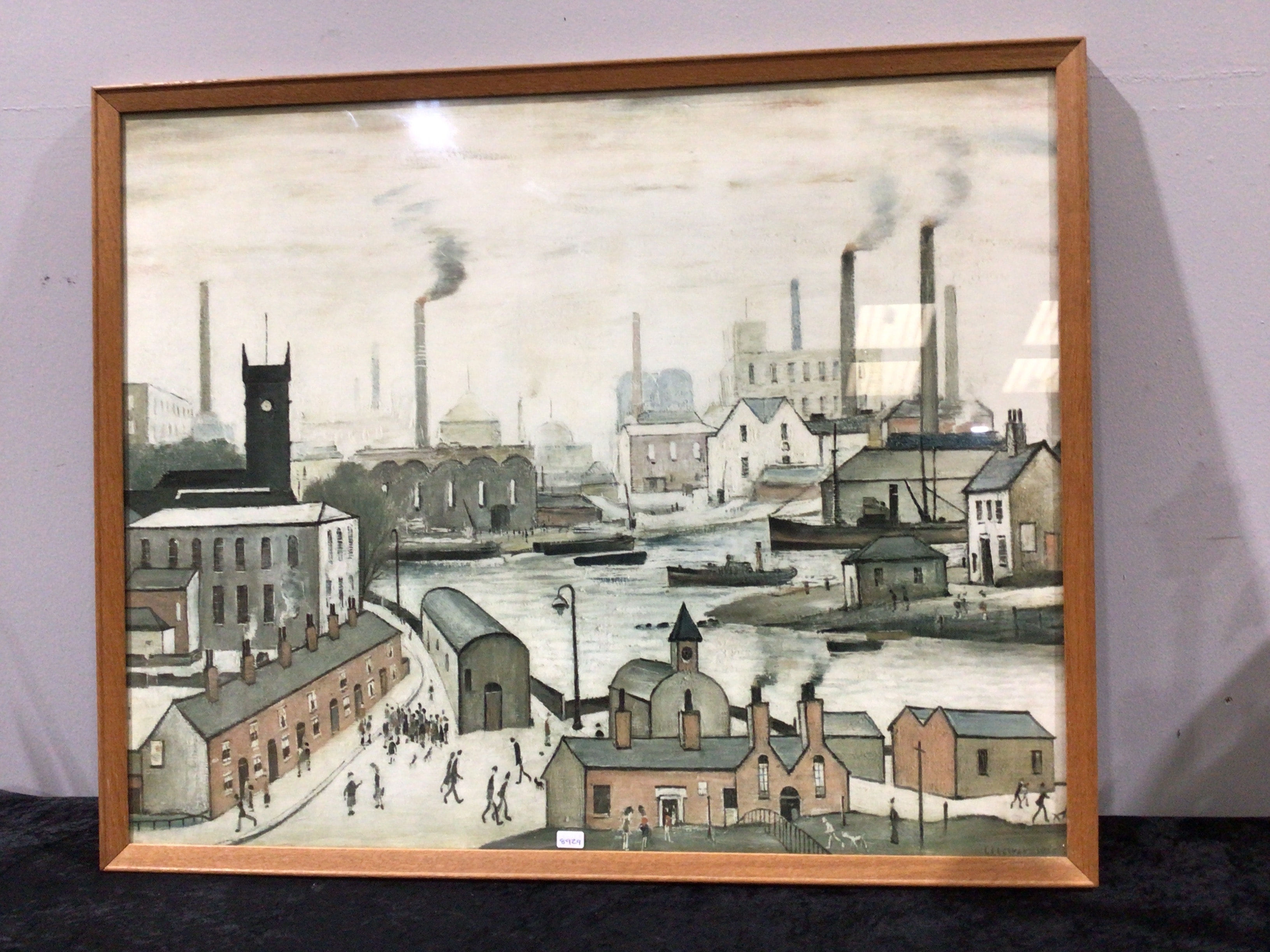 A single framed industrial landscape print by L.S. Lowry, predominantly in muted greys, browns, and whites, with a light brown wooden frame.
