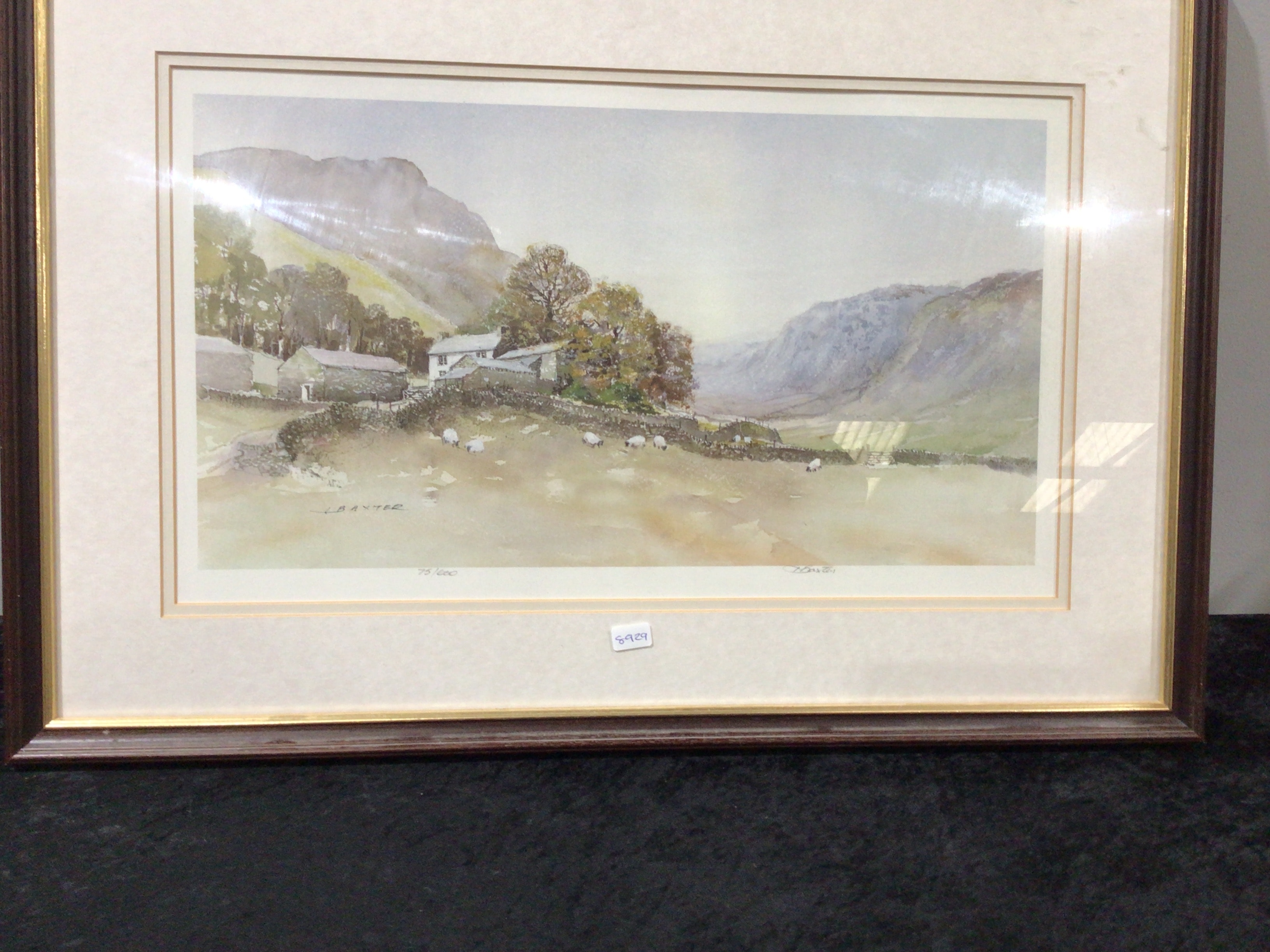 A framed print of a watercolor landscape depicting a farm and sheep with mountains in the background, primarily in green, brown, and grey tones, signed “L. BAXTER” on the left and “C. BAXTER” on the right, and numbered “75/800”.