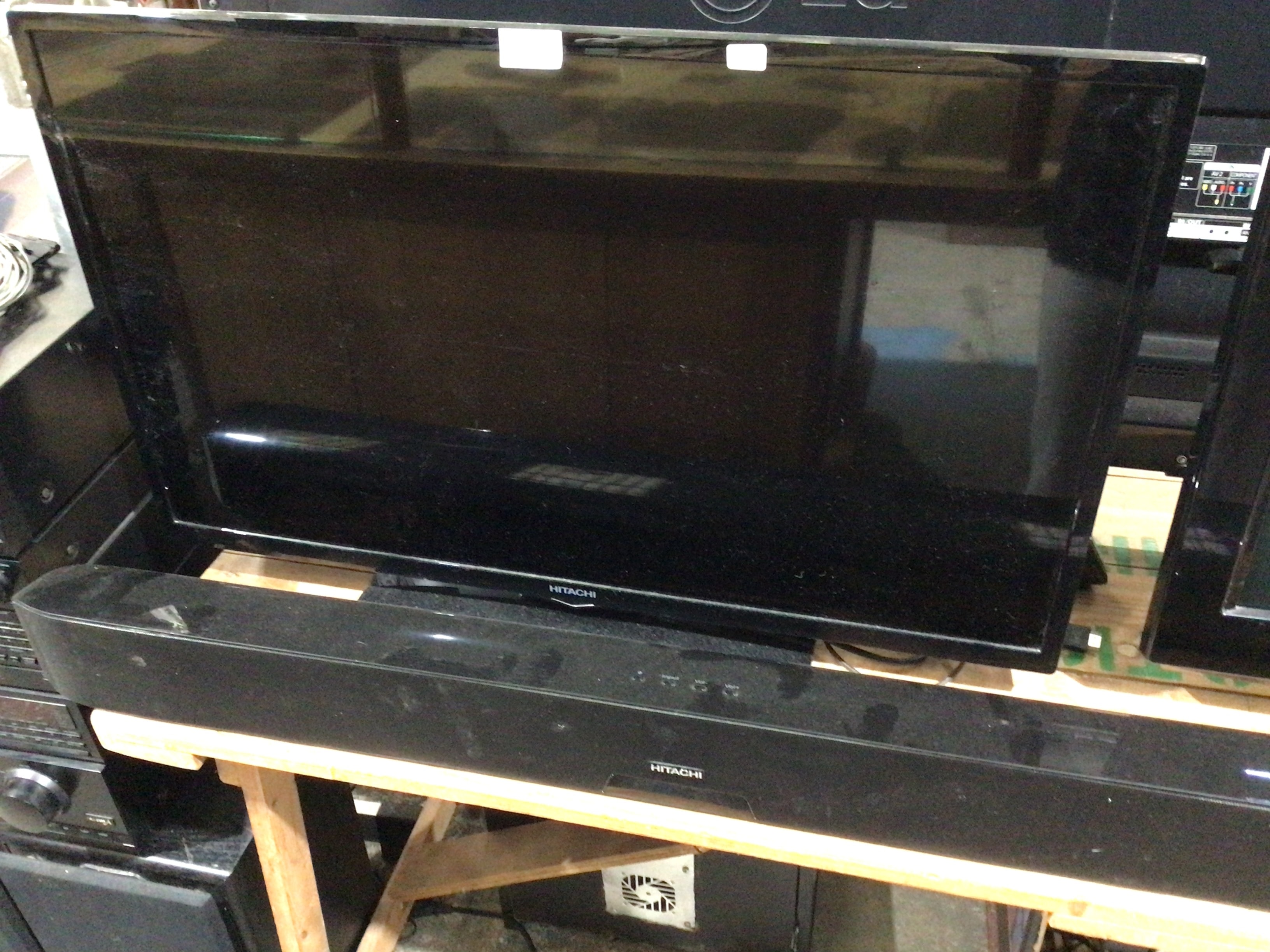 A black Hitachi 32 inch flat-screen television is accompanied by a black Hitachi AXS014BTU soundbar.