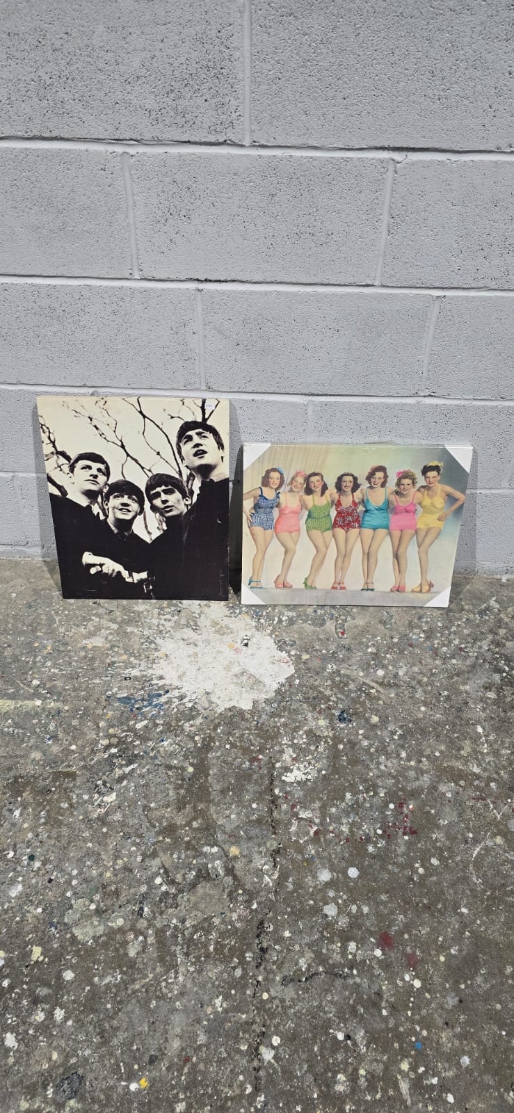 A contemporary wall art print depicting the iconic black and white photographic cover art for The Beatles’ album ‘With The Beatles’, featuring the four band members against a sparse, leafless tree background. Accompanying this is a second contemporary wall art print, a color photographic reproduction featuring seven women posing in vintage-style one-piece swimsuits, consistent with a 1950s-1960s aesthetic. Both items appear to be canvas or board-mounted.