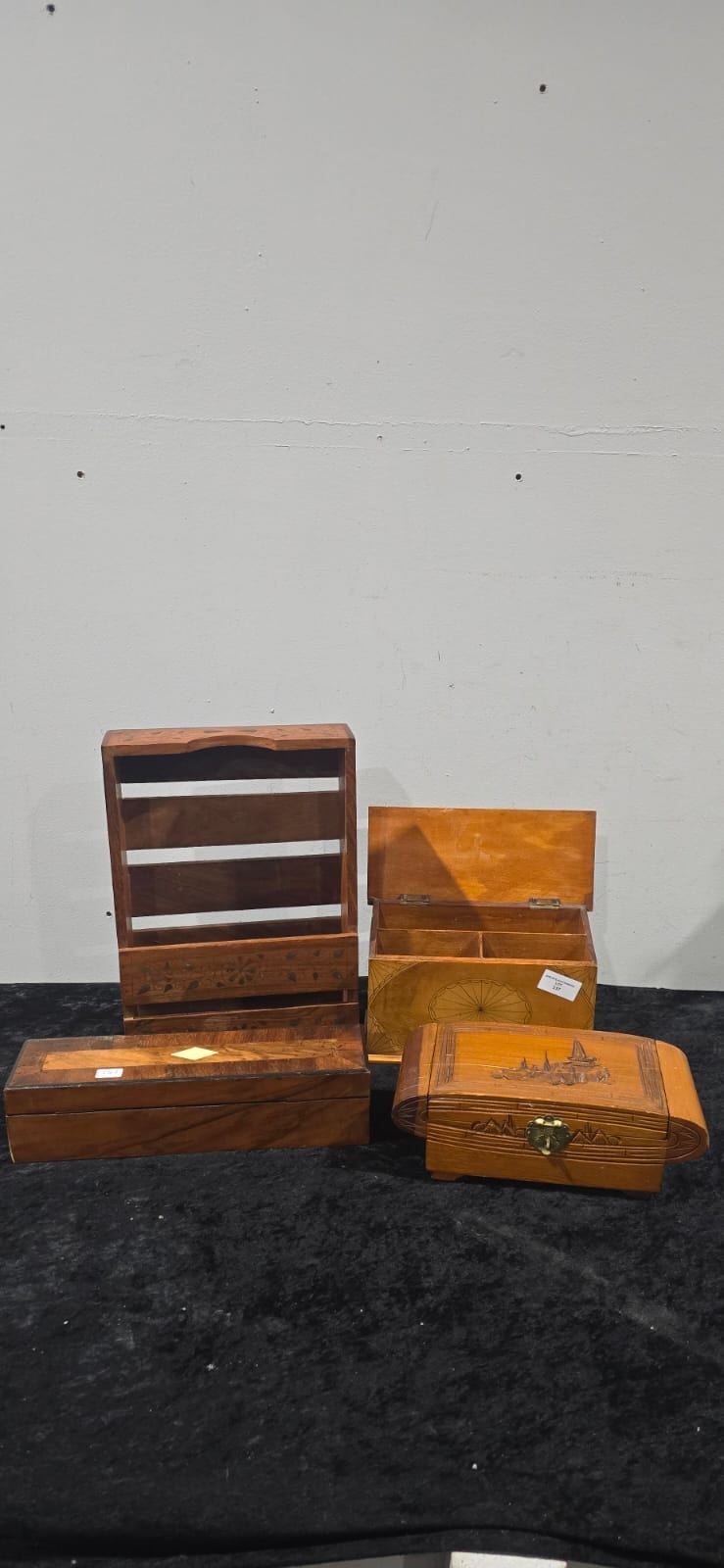 A group of four small wooden items, generally appearing to be modern decorative or souvenir pieces. The collection includes a dark-toned desk organizer with multiple vertical slots and a lower compartment featuring an inlaid or carved floral motif, alongside a matching dark-toned rectangular lidded box with a contrasting diamond inlay. Additionally, there are two lighter-toned wooden boxes: a rectangular lidded box with internal dividers, adorned with an incised compass rose or starburst pattern on its front and side; and a distinctive oval-shaped lidded box with a heart-shaped metal clasp, detailed with incised carvings depicting a city skyline on its lid and wave-like patterns on its sides. All pieces are crafted from wood of varying tones and finishes, displaying decorative elements such as inlay, carving, and incised patterns. Inventory stickers “131” and “237” are visible on some items, but no other definitive maker’s marks or translatable language is apparent.