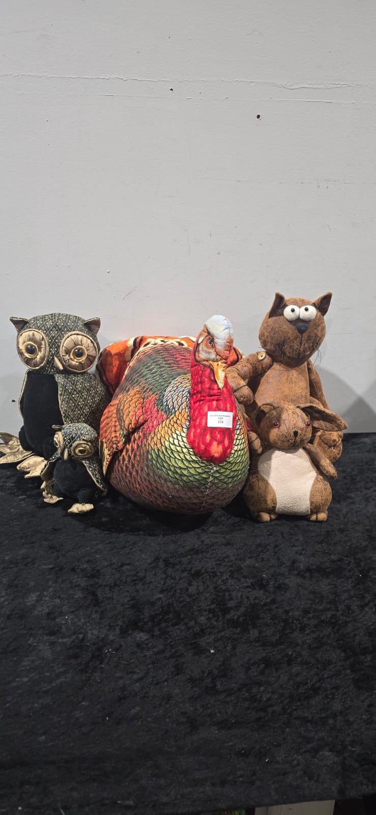 A group of five decorative fabric animal figures, including a John Derian For Target Beaded Plush Turkey. The large turkey figure is crafted from patterned fabric in hues of green, red, brown, and gold, and features a white label on its chest reading “SALES & AUCTIONS LTD. LOT 176.” To the left of the turkey are two owl figures, one large and one small, both made from dark fabric with metallic gold or bronze patterned accents. To the right of the turkey is a textured brown fabric figure resembling a cat, holding a smaller, lighter brown rabbit-like figure.