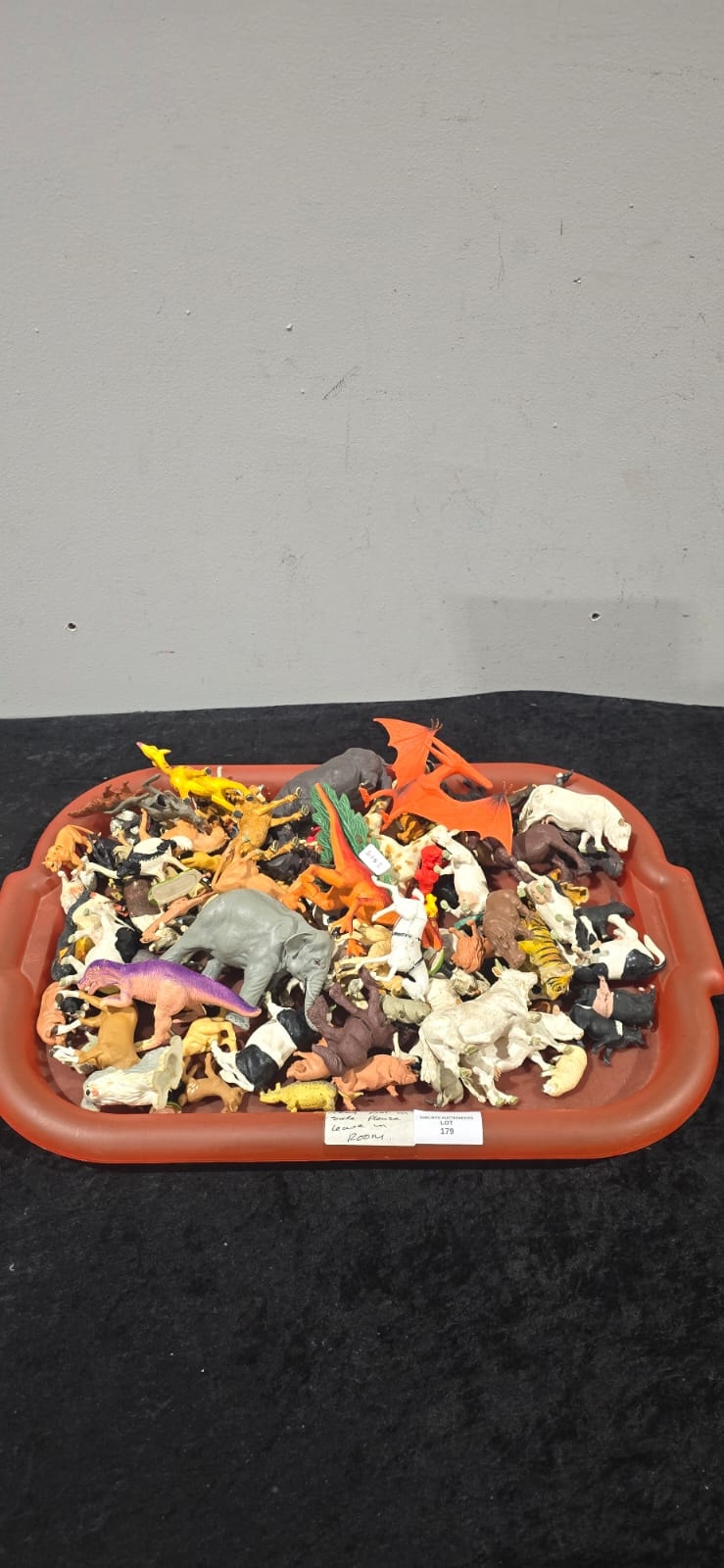 A diverse collection of small, multi-colored plastic animal figurines, presented within a translucent reddish-orange plastic tray with integrated handles. The figures encompass a variety of species, including domestic farm animals, wild safari animals such as elephants and tigers, and prehistoric creatures including dinosaurs. The overall style is consistent with mass-produced toys, likely originating from the late 20th or early 21st century. A white adhesive label affixed to the tray bears the handwritten inscription “Sale Ranza, leave in Room,” alongside the printed text “ONCLOTS PTY LTD” and “LOT 179.”