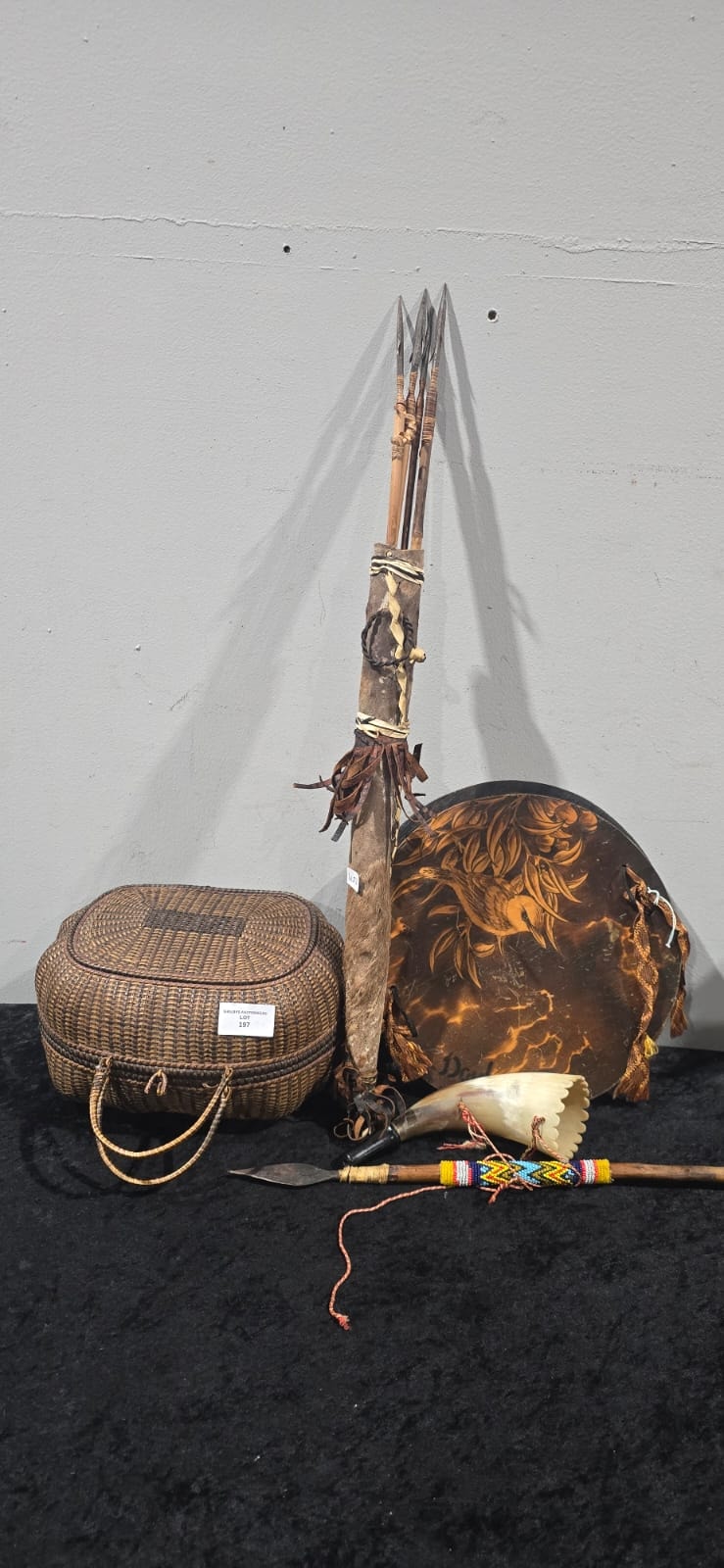 A collection of ethnographic objects, prominently featuring a circular, dark hide or shell shield, consistent with a Maasai tribal warrior shield, intricately decorated with etched or painted imagery of a bird and foliage, displaying ties and faint, illegible “De…” text at its base. The collection further comprises a lidded, rectangular-oval woven basket, likely of natural fibers, exhibiting handles and a white label marked “AUCTIONSALE.COM LOT 187.” Also included is a tall bundle of wood or bamboo-shafted arrows or spears with metal points, contained within a hide or bark quiver-like structure secured by natural fiber and leather bindings, bearing a “LOT 171” label. A natural animal horn, possibly a drinking or powder horn, with a fluted rim and a dark stopper, is present. Completing the group is a distinct wooden-shafted spear or arrow with a metal blade, notable for its colorful, geometric beadwork band.