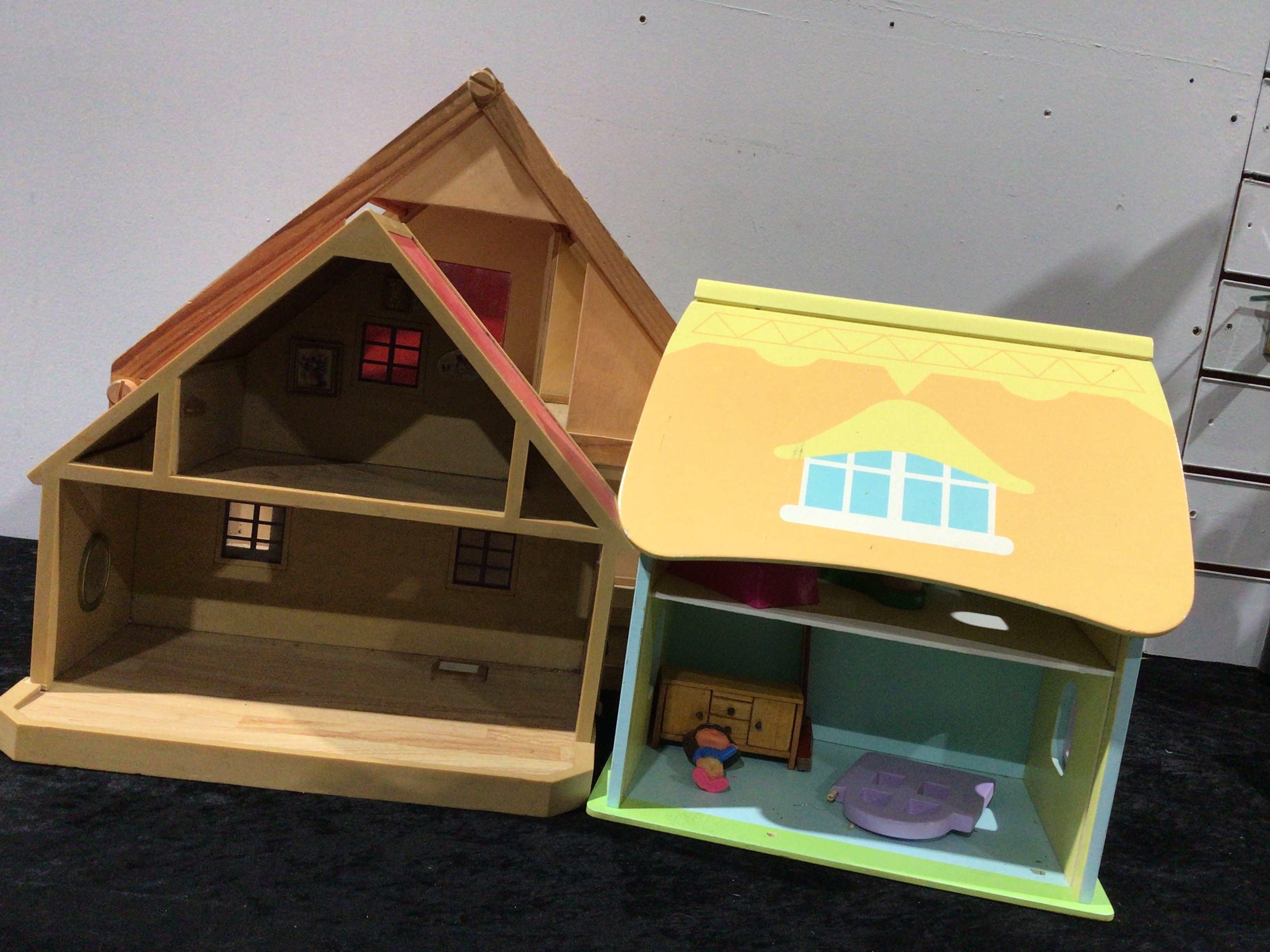A lot comprising two distinct open-front toy houses. The larger item, identified as a Calico Critters / Sylvanian Families Red Roof Cozy Cottage, is constructed primarily from light-toned wood or plywood, featuring a traditional gabled roof with red-painted trim, cut-out windows, and small framed pictures affixed to an interior wall. Its assembly reveals visible screw fastenings. The smaller item is a more stylized toy house, possibly crafted from painted wood or MDF, distinguished by a bright yellow rounded roof with an illustrated blue window and light blue/green interior walls. This smaller house contains miniature wooden furniture, a small multi-colored plastic figure, and a purple accessory.